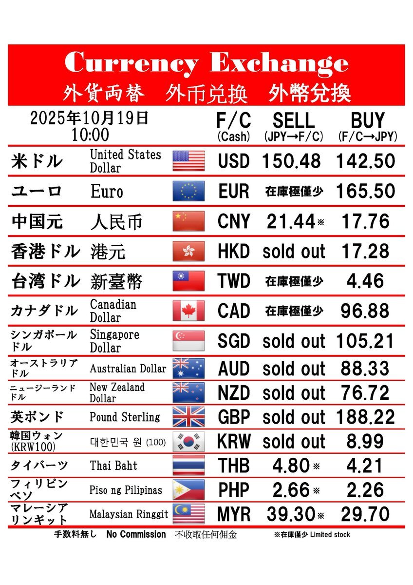 おはようございます #外貨両替フラッグスタッフ です 2025年10月20日(月)の両替レートです Skypeサービス終了に伴い「050-5539-9999」の提供が終了しました 今後は eメール info@flagstaff.co.jpにてお問い合わせ願います 宜しくお願い致します #横浜 #中華街 #海外旅行 #外貨両替 #exchange #yokohama pic.x.com/W4DNkJog6y