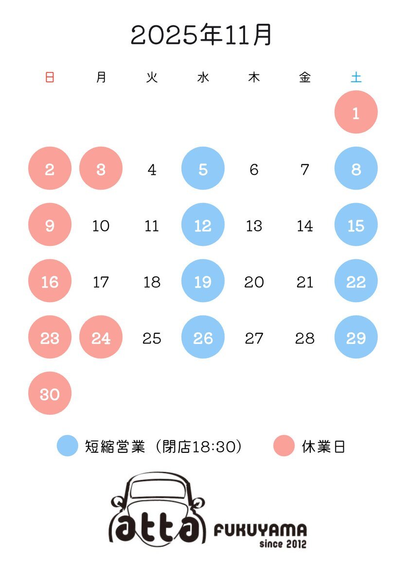 【11月の営業日について】 11月の営業日は下記の通りです。 通常の営業時間は 9:30〜19:00 です。 毎週水・土は 〜18:30まで。 定休日は、第一土曜日・毎日曜日・祝祭日です。 #福山市 #輸入車 #外車修理 pic.x.com/uaYMVjdoCo
