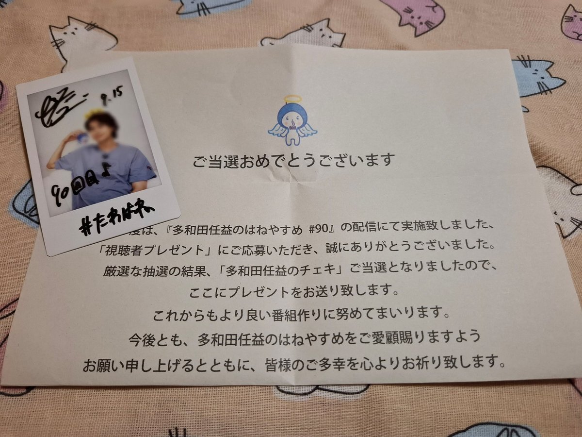 9月配信のはねやすめ視聴者プレゼントだったチェキ 当選しました…………!!🤯🤯🤯 直筆サインとか初めてで『本当に書いてある!』と感激してしまった😳 ありがとうございました!大切にします…!! #多和田任益 #たわはね #多和田任益のはねやすめ pic.x.com/qdqfaxQSiy
