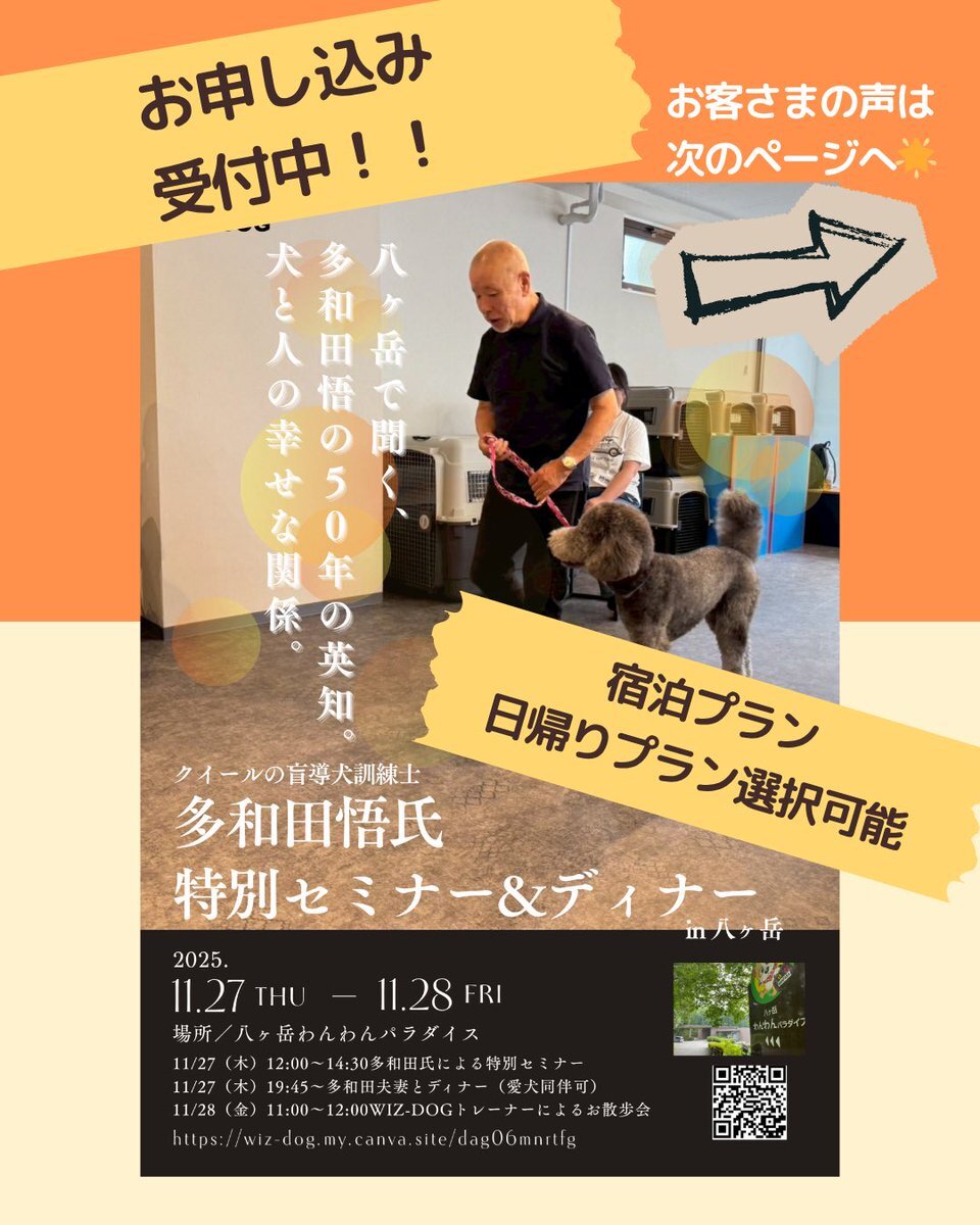📢多和田悟氏特別セミナー&ディナーin八ヶ岳前日までお申し込み可能!! 多和田氏のセミナーには新たな気づきや発見がたくさんあります🌟 ぜひこの機会にご参加ください!! ※一週間前からキャンセルはお受けできかねます。 恐れ入りますが、ご了承ください🙏 #wizdog #多和田悟 #盲導犬クイール pic.x.com/YNFe4hAnfa