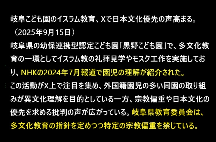岐阜のこの保育園はクラスに30人の外国人がいて「他文化教育」としてイスラム教のモスクの祈りの仕方を教えて粘土ではモスクを作っている。友達が「モスクで遊んでた」と言ったら別の子が→「モスクは遊ぶ場所じゃないお祈りする場所」と。 だから舐められるんだぞ? x.com/mintia66/statu…