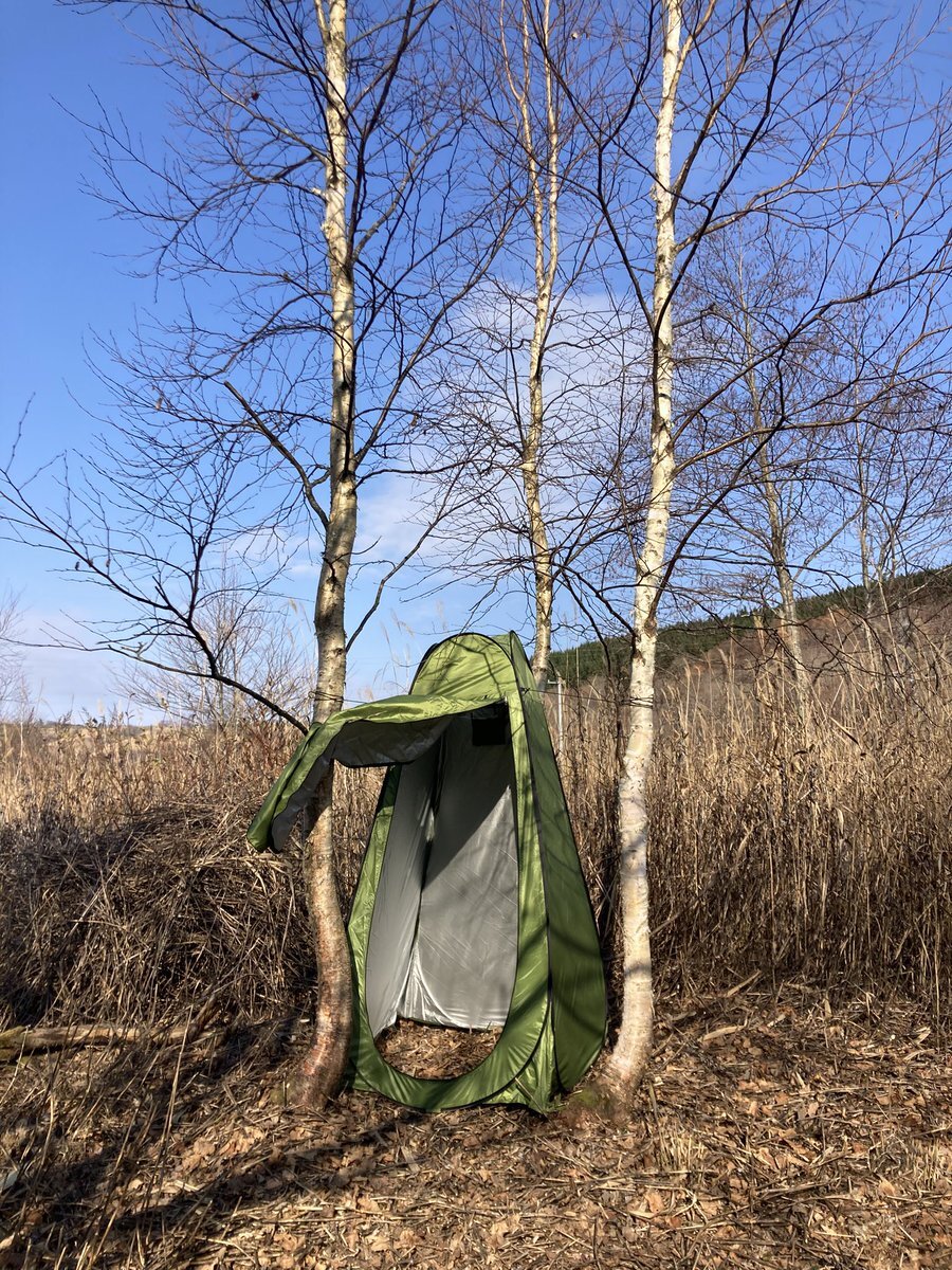 車中泊避難生活日記⛺️ 着替え シャワーやトイレに使えるかなと数年前に買っていたのに 使う余裕が全くなかった多目的ポップアップテント ペグと木にひもでつないでまず天日干し→ #香害と農薬からの避難 #ライフラインなし #ホームレス状態 #シックハウス症候群と #多種化学物質過敏症の夫と pic.x.com/22mUg7Kw1H