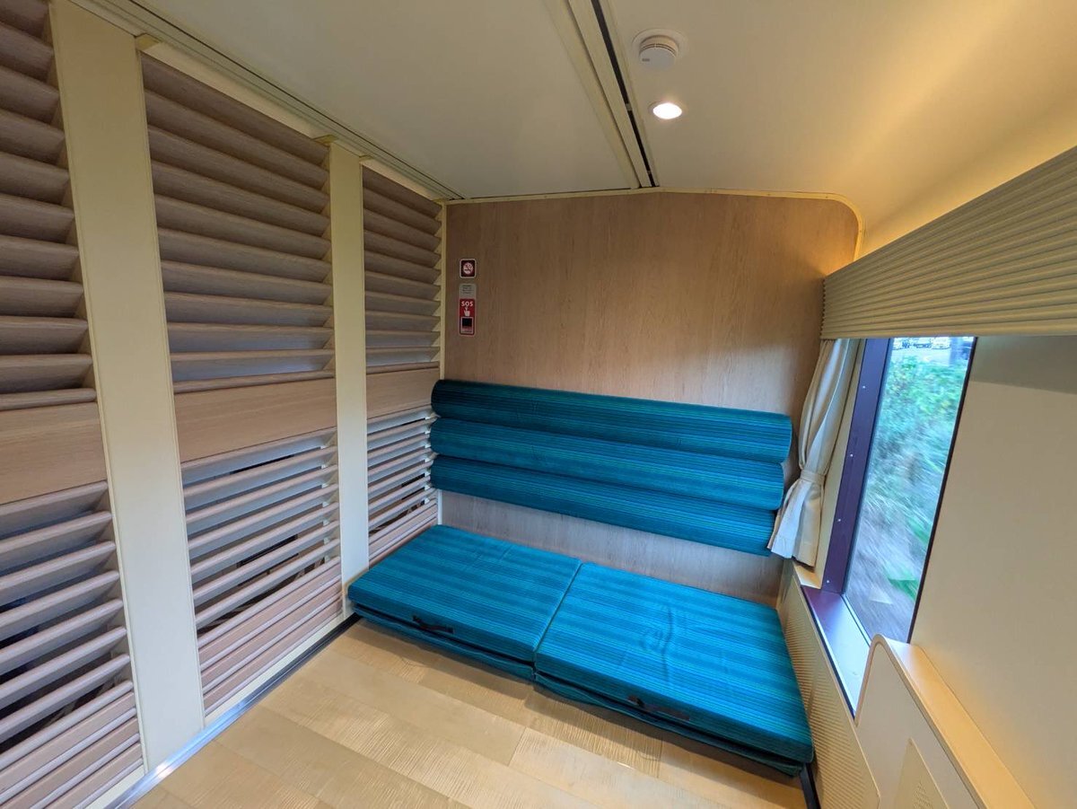 銀河にて今回利用した席は半個室の「クシェット」です。靴を脱いでプライベートな空間を過ごせます。銀河の座席生地を使ったクッションでゆったり過ごします😌 #銀河 #夜行列車 #JR西日本 pic.x.com/sfHuCAkUyV
