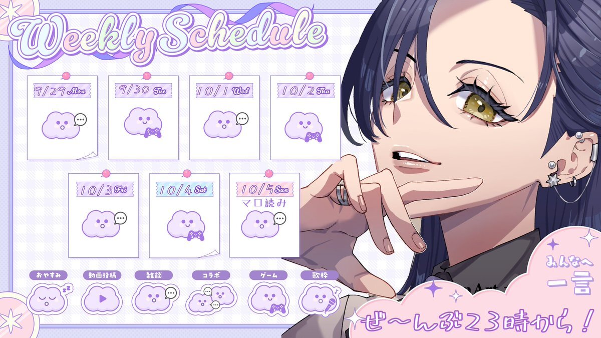 🗓 週間スケジュール 🗓 9/29 ~ 10/5 初配信ウィーーーク!!!!! やるぞやるぞやるぞ〜‼️‼️‼️ 【ワンチャン遅れる可能性あります】 #夢の幕間で逢いましょう pic.x.com/y94SM5utMX