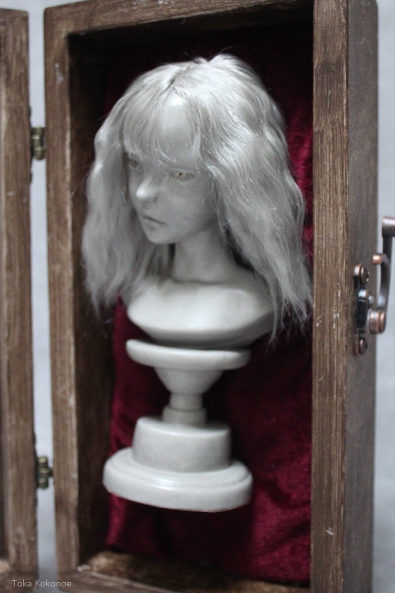 11/28〜12/2「 #夢見るギニョール展 -夜の映画館-」 「Invitation-インヴィテーション-」 月夜野いん子 @moonbird_789 撮影中の事故により上映が中止となった幻の映画 送られてきたのは謎の招待主からのチケット 今宵、夜だけの特別な上映会がはじまる 石粉粘土使用、球体関節人形 高さ62㎝
