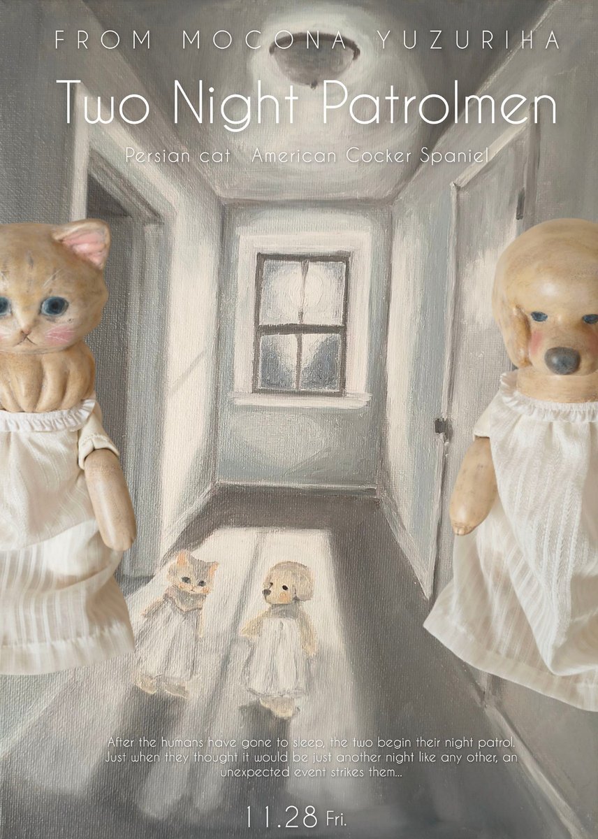 11/28〜12/2「 #夢見るギニョール展 -夜の映画館-」 「二匹の夜廻り」楪もこな @Yuzuriha_Mocona 人間が寝静まった夜に始まる二匹の夜廻り。 いつもと変わらない夜だと信じいていた矢先に思わぬ出来事が二匹を襲う…。 全世界が驚愕した、二匹の瞳に映る真実とは。