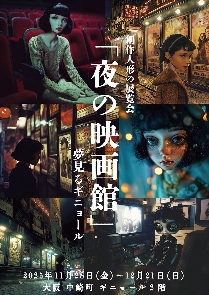 2025年11月28日(金)〜12月21日(日) 創作人形展覧会 「 #夢見るギニョール展 -夜の映画館-」 今回のテーマは「夜の映画館」 夜中にひっそりと上映されている映画をイメージした展覧会。架空の上映作品からイメージした作品や、映画館そのものから広がるイメージを形にします 後半から通販あり