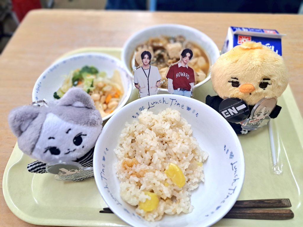 娘の小学校の給食試食会におじゃましてきましたwithウォンキ♡ 栗ご飯・肉豆腐・じゃこまめサラダでした。すごく美味しかった✨前の机にいた保護者の方がぬいを見て、かわいい♡私も推し活してます♡と話しかけてくれました笑 engeneだったらよかったな笑 #大人engeneさんと繋がりたい pic.x.com/qvpzU7pDlL