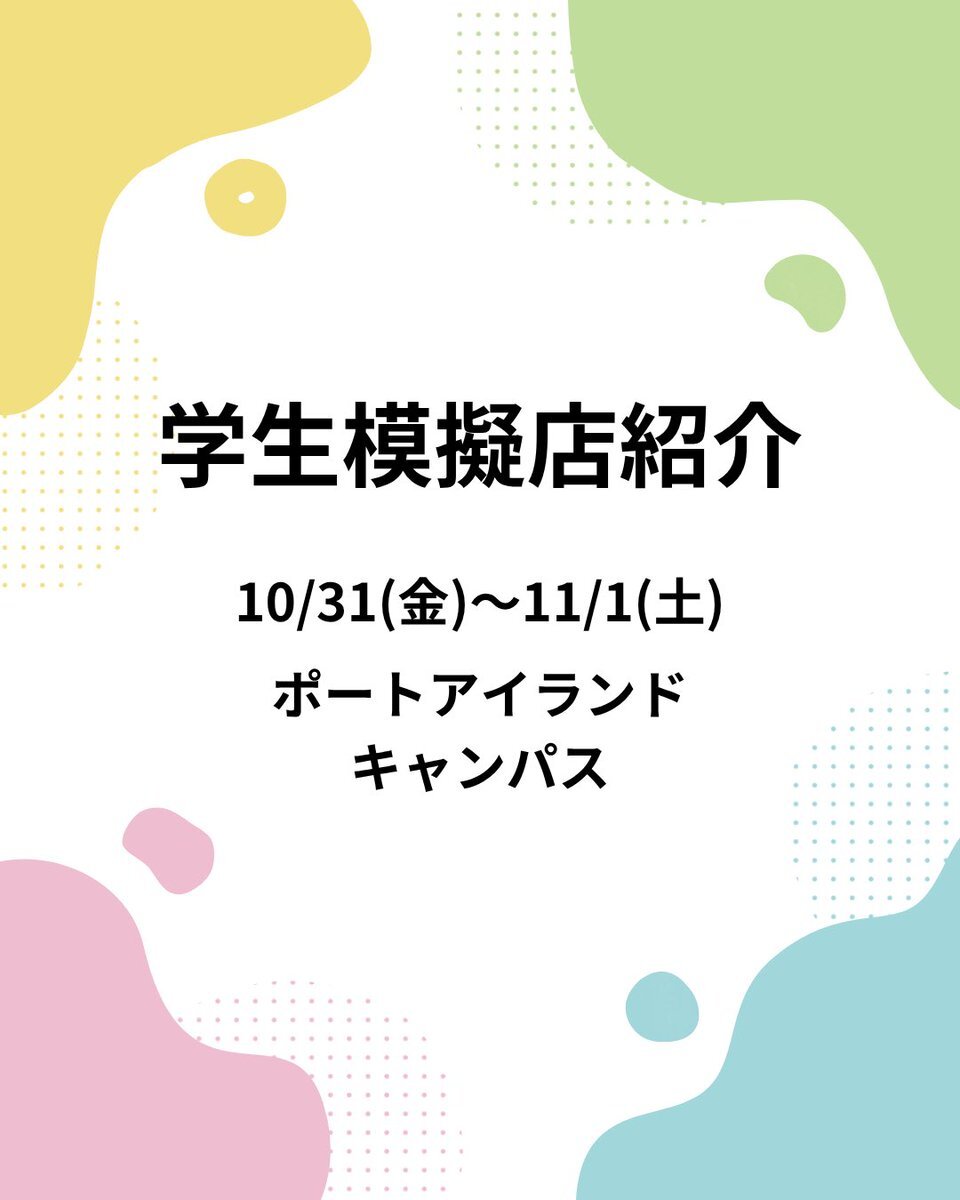 10月31日、11月1日のポートアイランドキャンパスの学生模擬店を紹介します! 10月31日10:00~16:00 11月1日 10:00~15:00 #神戸学院大学 #神戸学院 #大学祭 #大学祭中央実行委員会 #大学祭実行委員会 #中実 pic.x.com/BnGnaOYnx4