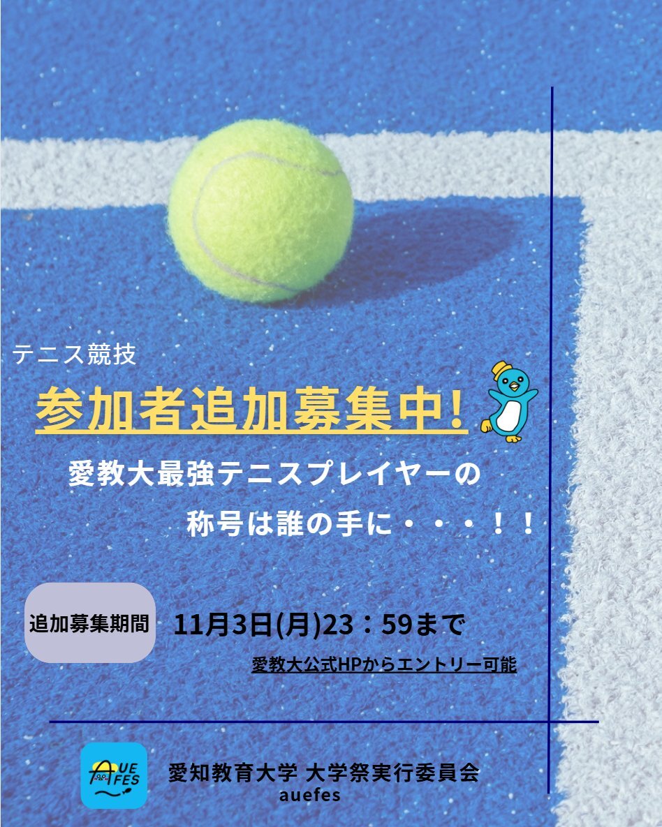 📢テニス競技の参加者追加募集に関するお知らせ おはようございます🌅 大学祭実行委員会です! 現在、秋の祭典テニス競技の参加者の追加募集をしています!! 腕に自信のある人、テニスを楽しみたい人誰でも歓迎なのでぜひ参加してください💪 期限は11/3(月) 23時59分です!!