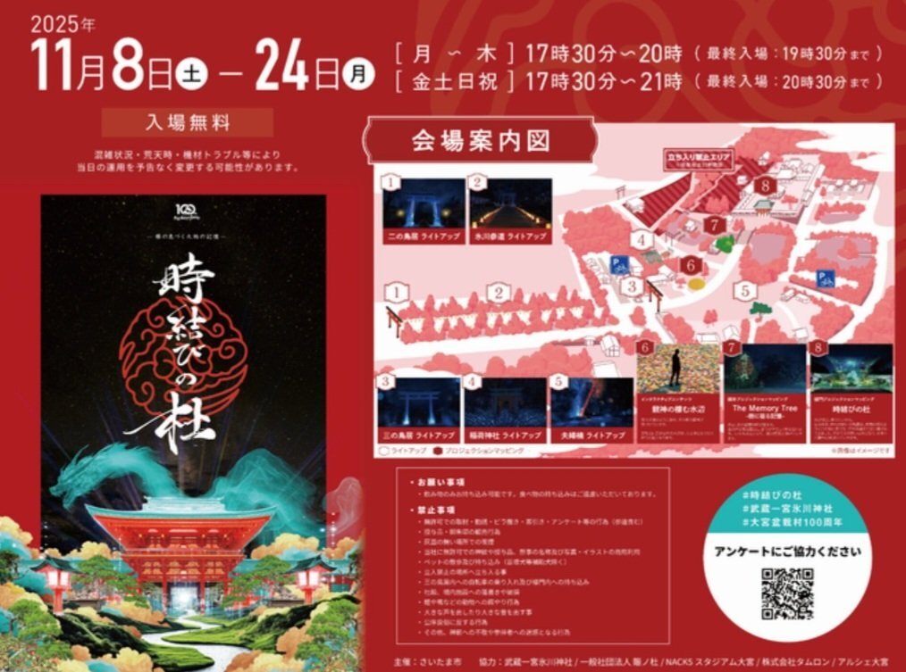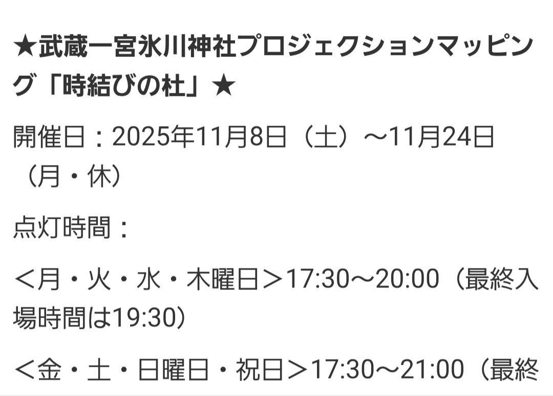 ✨大宮氷川神社プロジェクションマッピング 11/8~24開催。月~木17:30~20:00・金土日は21:00迄。⛩️や参道も美しくライトアップされる。盆栽村100周年記念。氷川神社は沢山あるが総本社の大宮です! #武蔵一宮氷川神社 #大宮氷川神社 #盆栽村 #プロジェクションマッピング #ライトアップ #氷川神社 pic.x.com/x73EaqWYfR