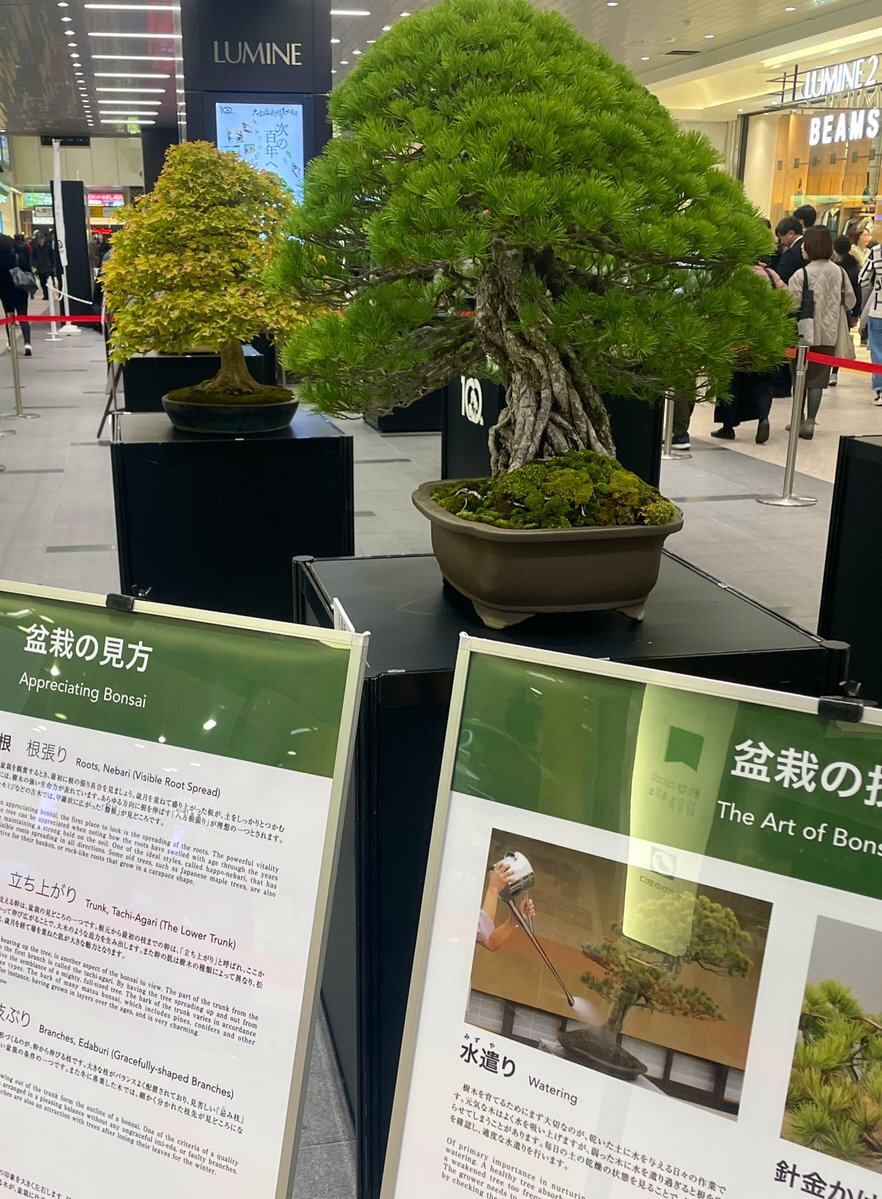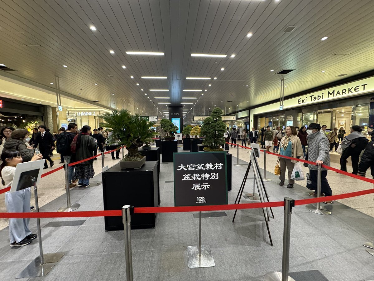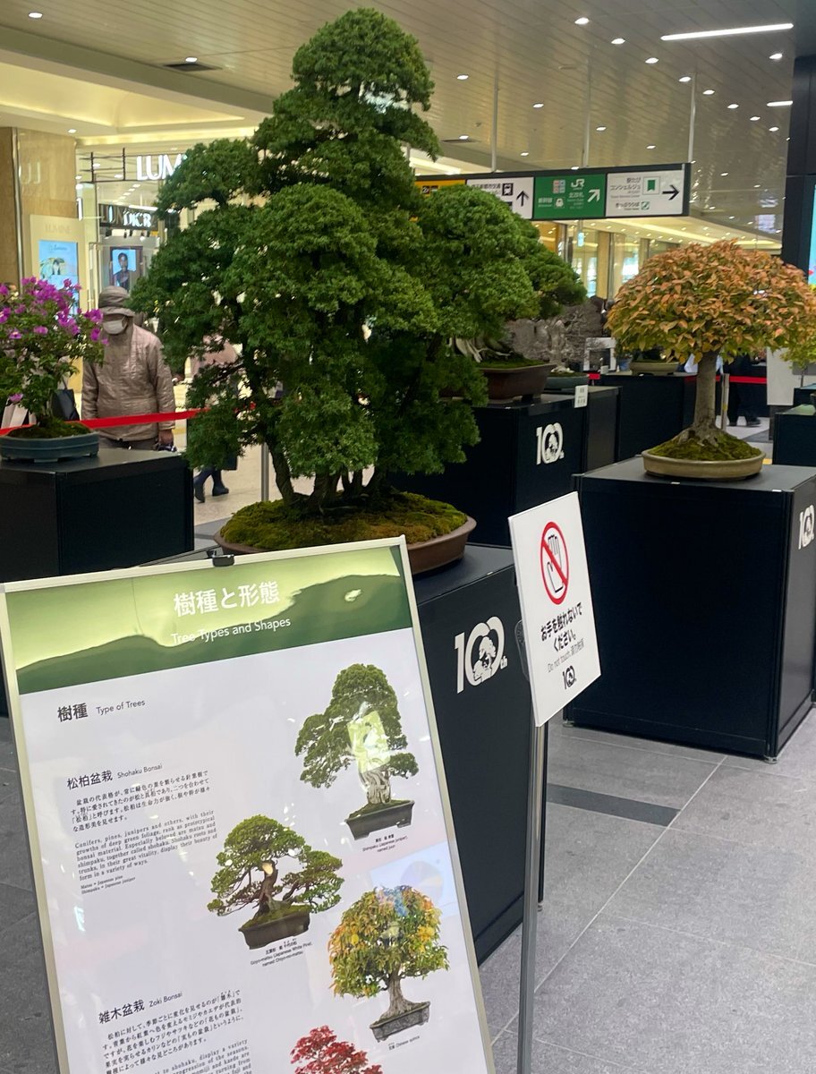 大宮駅東西連絡通路に展示された盆栽と鐘塚公園の「盆栽夜市」(昼間ですが)。 #大宮盆栽村100周年 #盆栽 #大宮駅 #鐘塚公園 #盆栽夜市 pic.x.com/7cnqNx7fQe