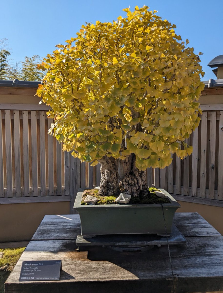 #大宮盆栽美術館 樹種:#いちょう 銘学名:Ginkgo biloba  寸法幅:68cm x 高:95cm 悠然とした趣きの太い幹が特徴的な、いちょうの古木 四季を通じた葉の色味の変化とともに、長い歳月を経て荒々しい姿を見せる樹皮が本作の見どころである 推定樹齢 50年 pic.x.com/iJ2xRRBwfo