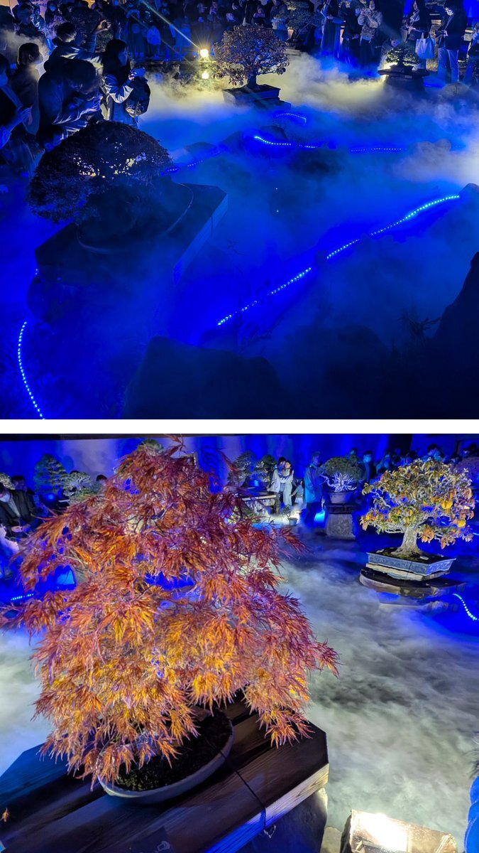 スモークに包まれ幻想的に…大宮盆栽美術館で特別ライトアップ テラスから庭園を一望 浮かび上がる60鉢の盆栽、来場者を魅了 24日まで saitama-np.co.jp/articles/167222 #埼玉県 #さいたま市 #大宮盆栽美術館