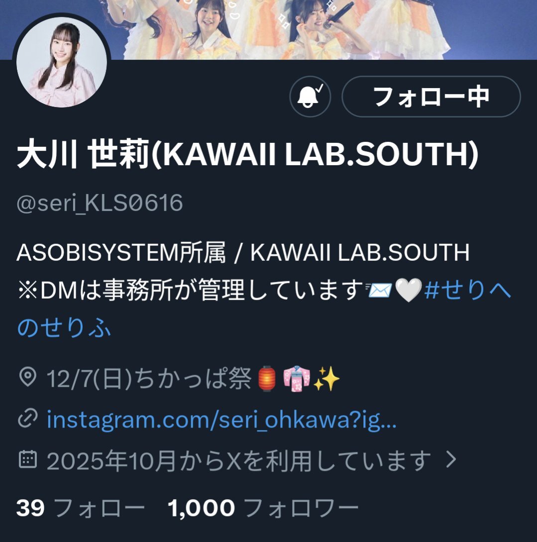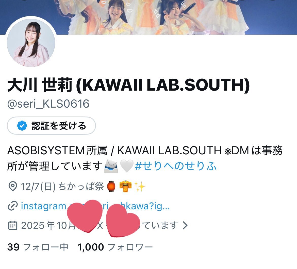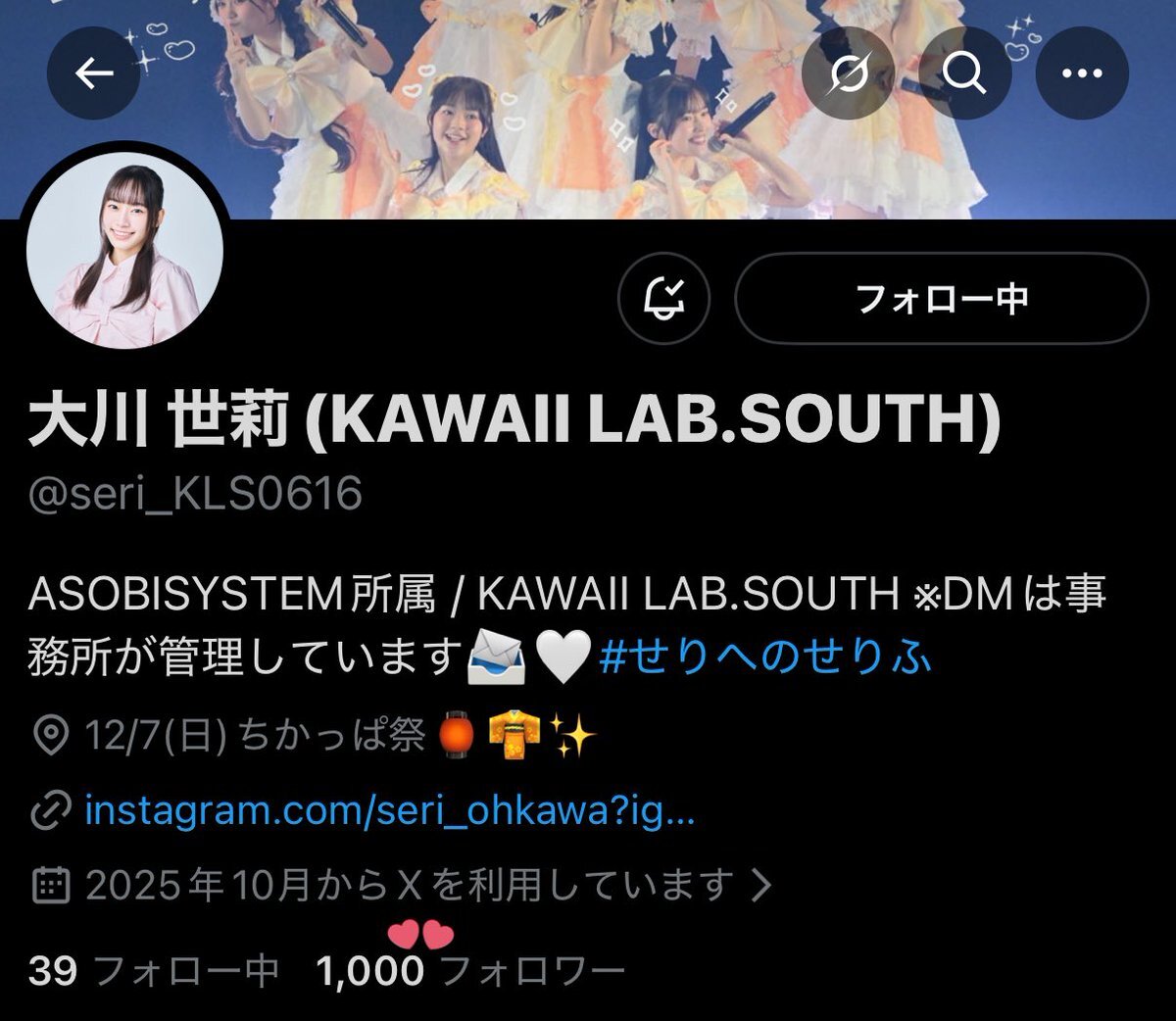 世莉ちゃん1000人達成おめでとう🎉 どんどん有名になっていく世莉ちゃんをこれからも応援し続けるよー!!! 次は1500人だ!!! #カワラボサウス #大川世莉 #せりへのせりふ pic.x.com/ZwtzEmv8vY