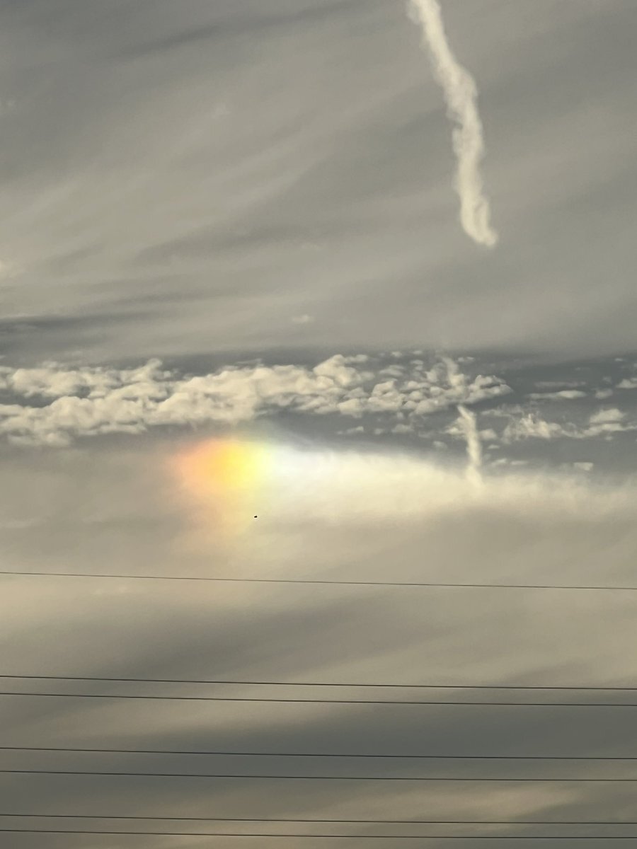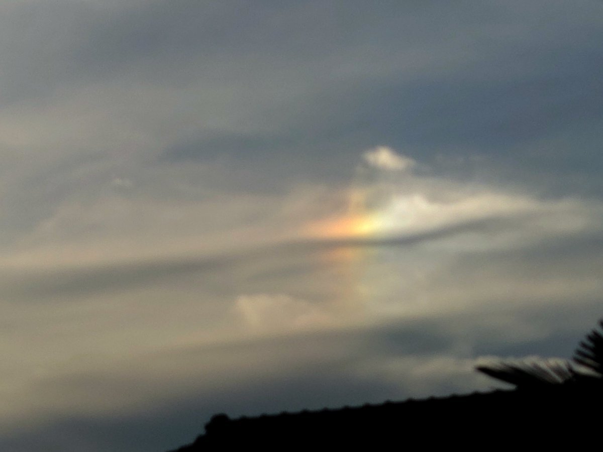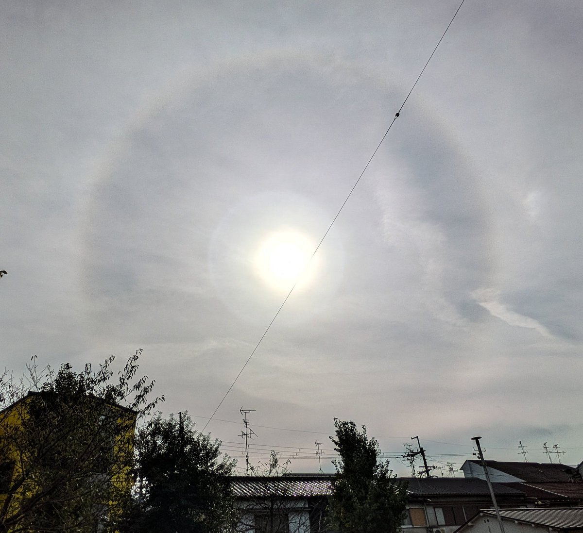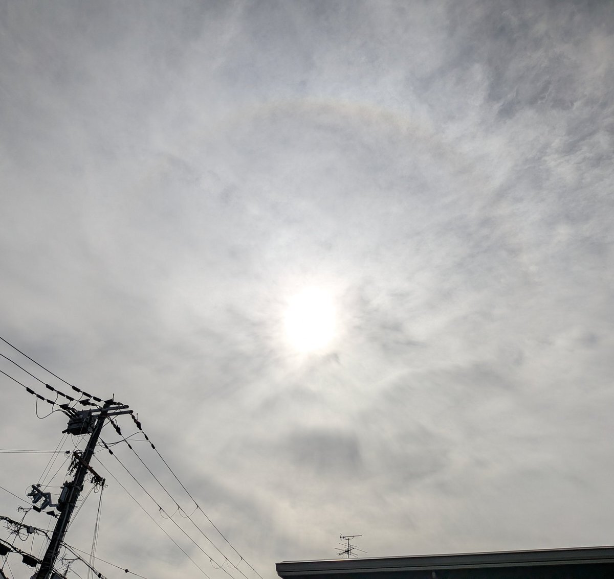 家に帰ってから見たら、うっすら幻日も見えたんだけど(これまたアンテナとかあって見難い💧)、その代わり、太陽の上にうっすら虹色が🌈 環天頂アークにしては位置が低い様な気がするから、上部タンジェントアークかな? #大気光学現象 #halo_jp pic.x.com/9XwjyhVkcL