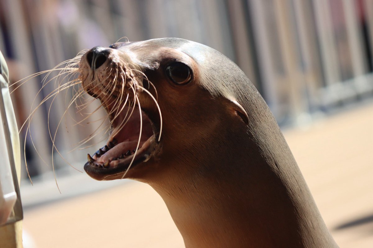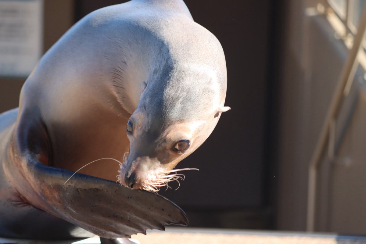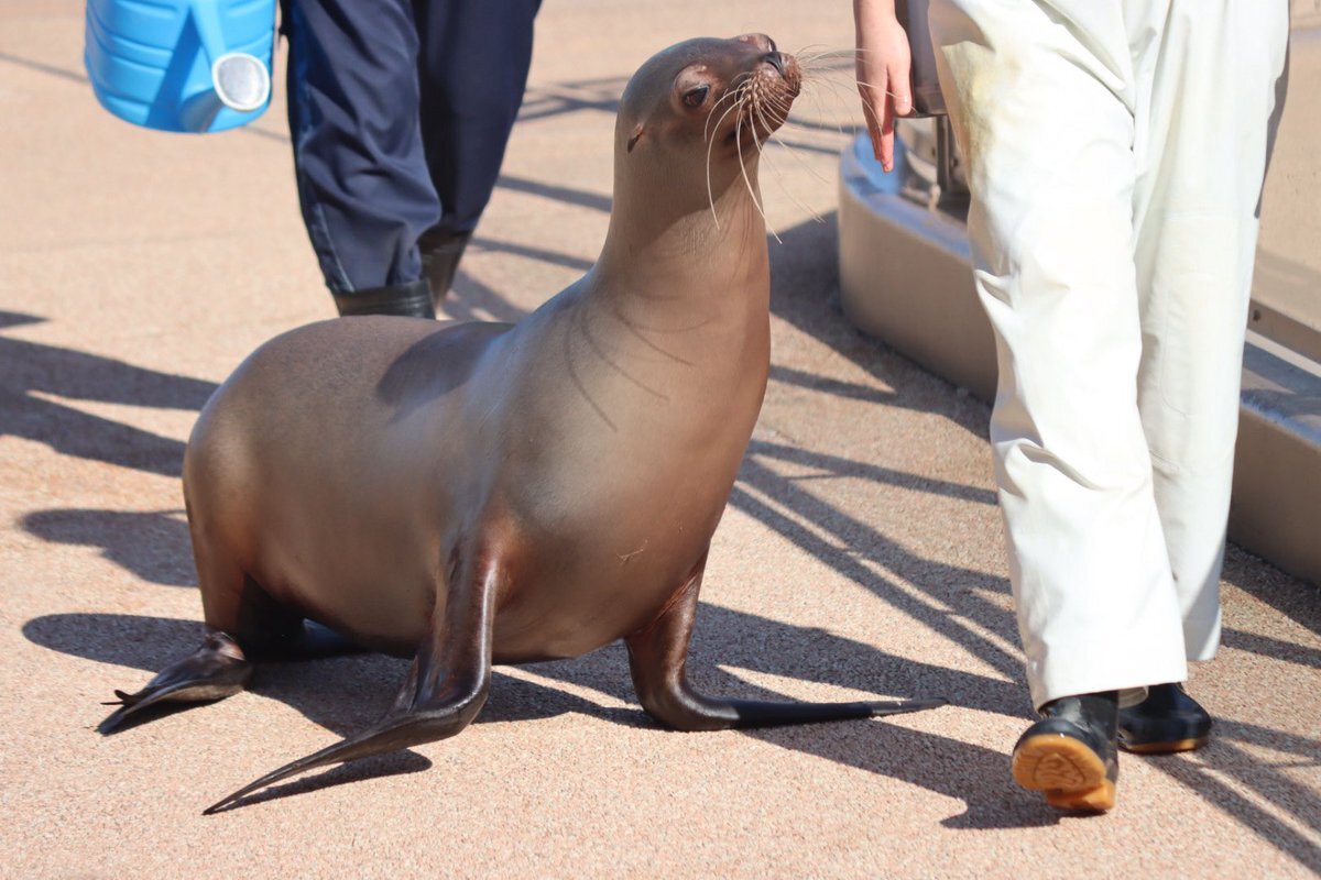 上に上がってアシカお散歩タイム 見学中のサーフ🩵 前を通るとそわそわ… プリンちゃんじゃなくてナッツだよ〜🤭 #大洗水族館 #カリフォルニアアシカ pic.x.com/ugZUm3MBtO