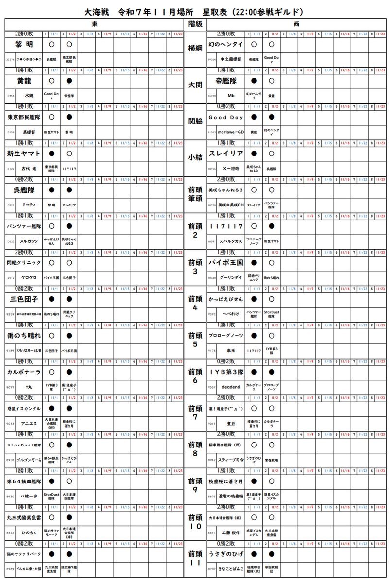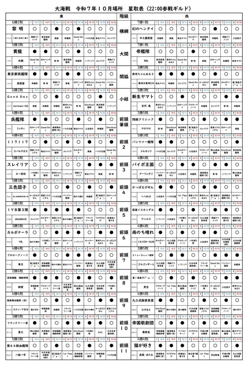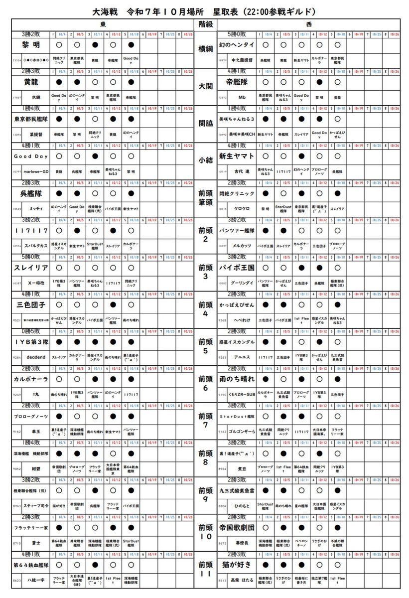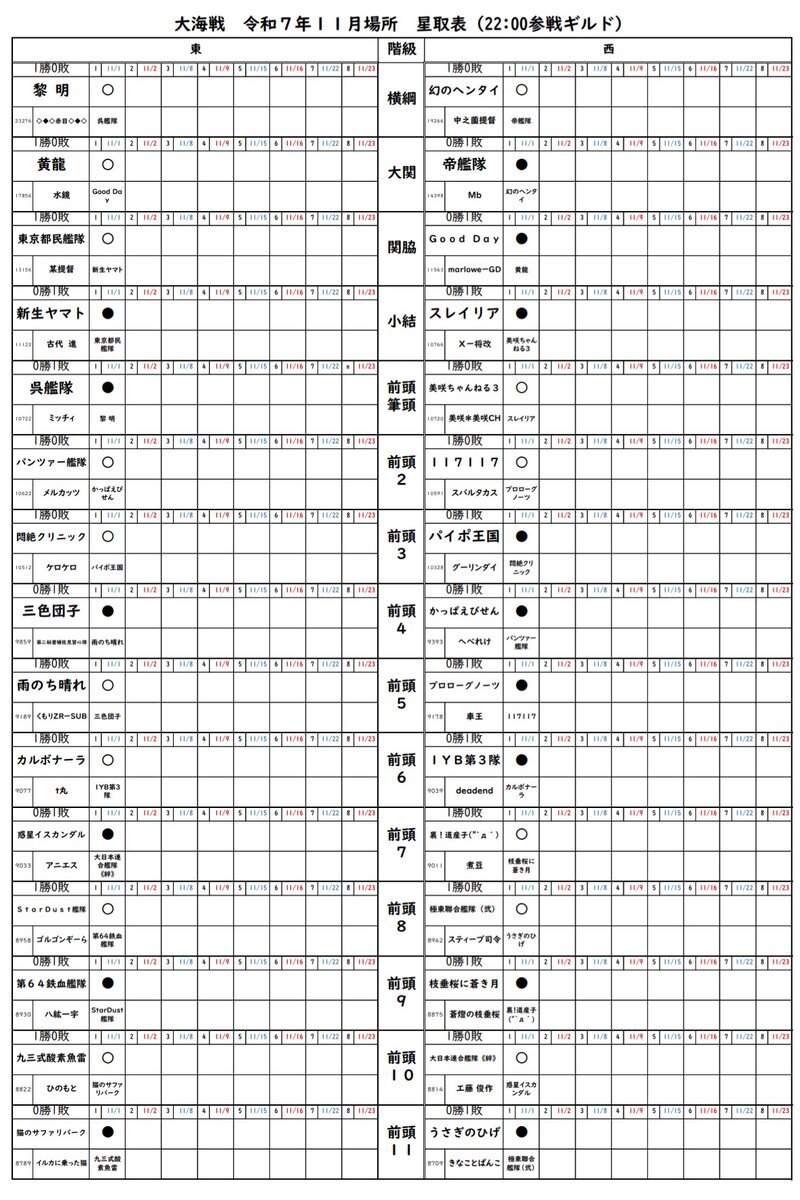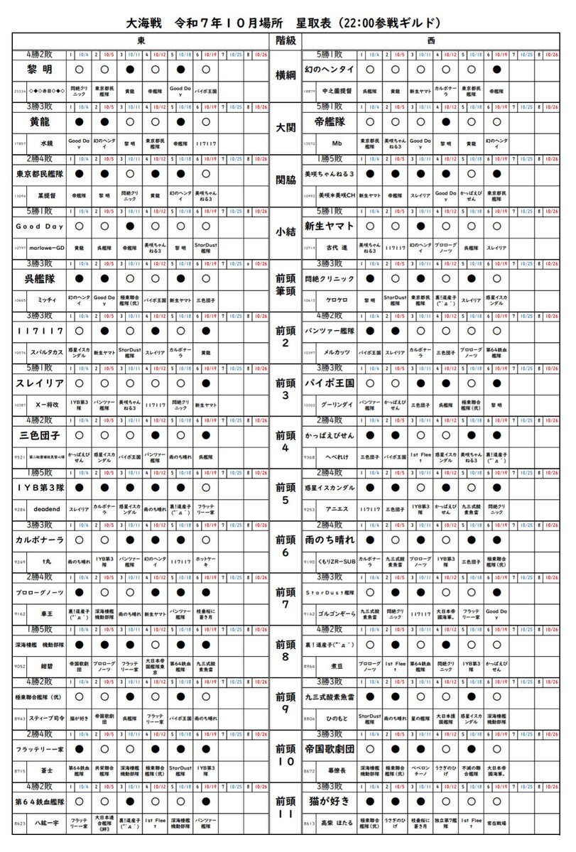 お待たせしました。 10/26(日)で千秋楽となりました「10月場所」星取表です。 三賞、ギルド順位表も併せてご覧ください。 今回はギルド「Good Day」さんの躍進が光りましたね。 次節は、「11月場所」となります。 予想番付は別にUP致します。 #蒼焔の艦隊 #大海戦 pic.x.com/XRZkyHtace