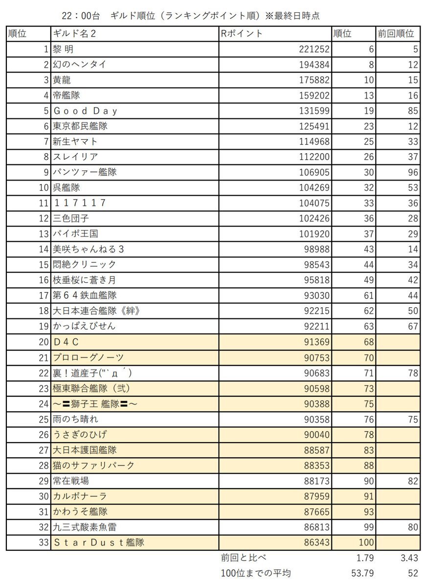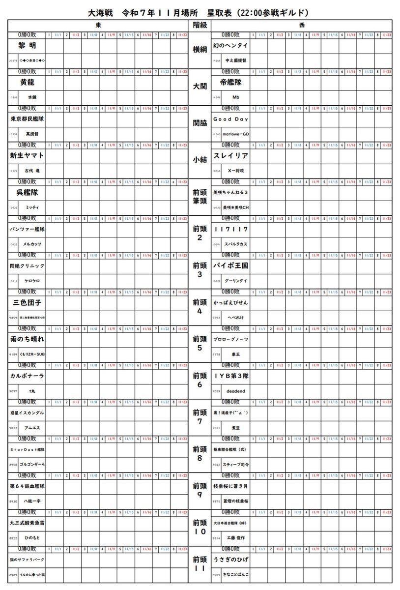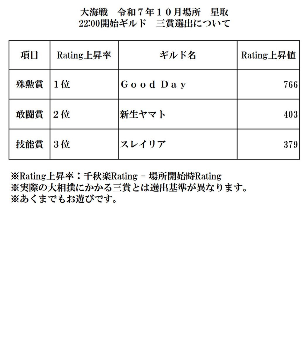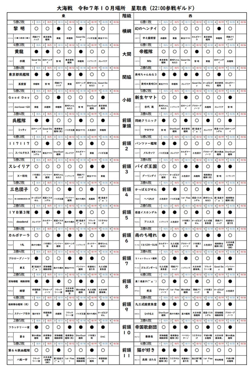 お待たせしました。 10/26(日)で千秋楽となりました「10月場所」星取表です。 三賞、ギルド順位表も併せてご覧ください。 今回はギルド「Good Day」さんの躍進が光りましたね。 次節は、「11月場所」となります。 予想番付は別にUP致します。 #蒼焔の艦隊 #大海戦 pic.x.com/XRZkyHtace