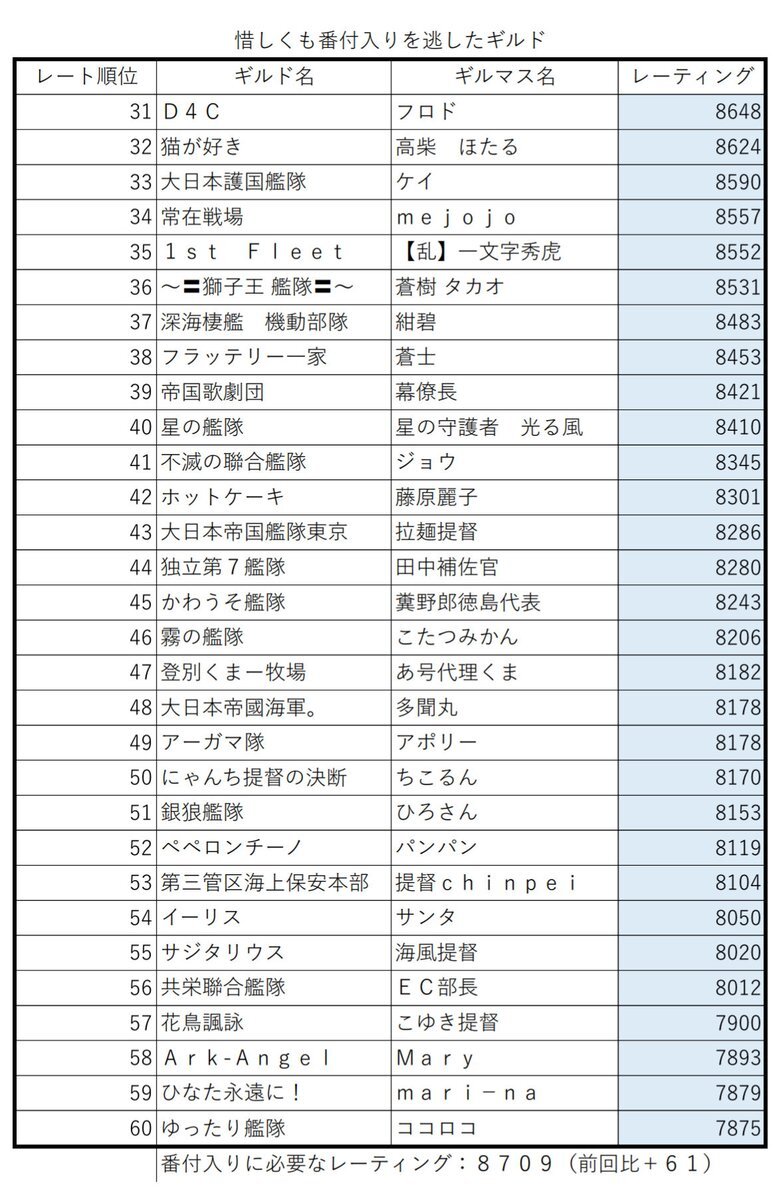 R7.11月場所の星取表予想番付&今回惜しくも番付入りを逃したギルドです。 幕内入り必要レートは前回比61上がり、8,709となりました。 万が一、抜け又は漏れ等ありましたら水鏡まで教えてくださいませ。 次節もよろしくお願いします🙇 #蒼焔の艦隊 #大海戦 pic.x.com/MOFxGxkxqf