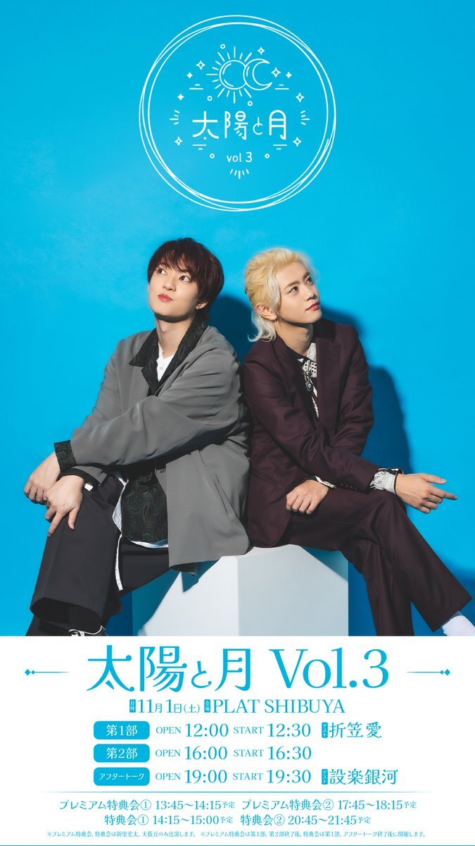 ☀️太陽と月Vol.3🌙 第3次抽選、本日より受付開始‼️ 10/25(土)20:00〜10/30(木)23:59 【URL】 t.livepocket.jp/e/sun-and-moon… ビデオメッセージ第2弾もお届けします📹 当日はなんと、、、?👕✨ ぜひお楽しみに⭐️ #大薮丘 #新里宏太 pic.x.com/MZAVaCKzyy