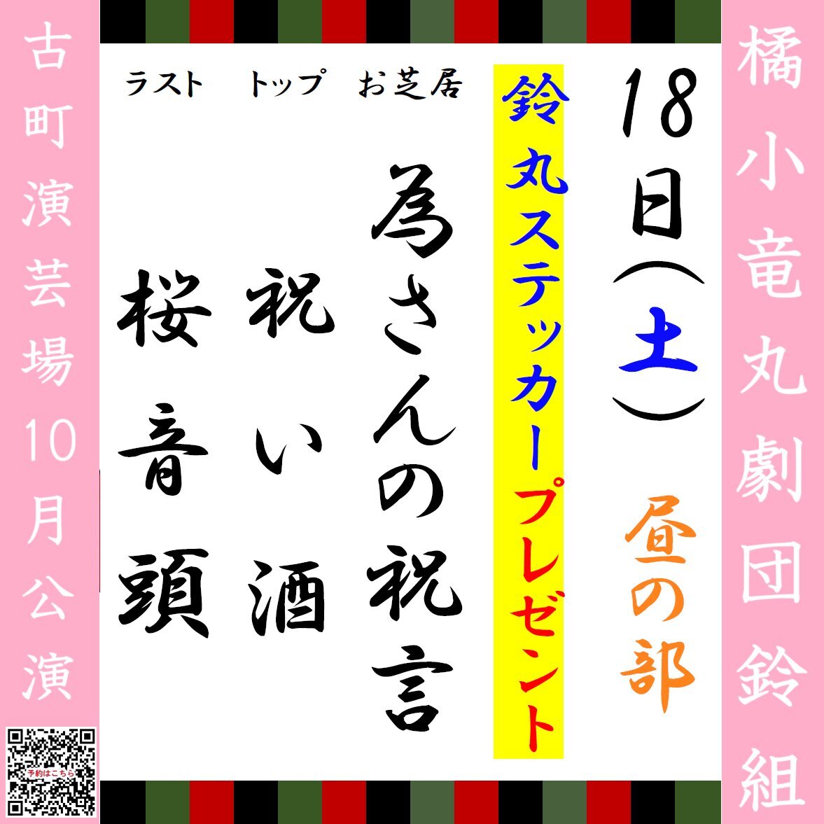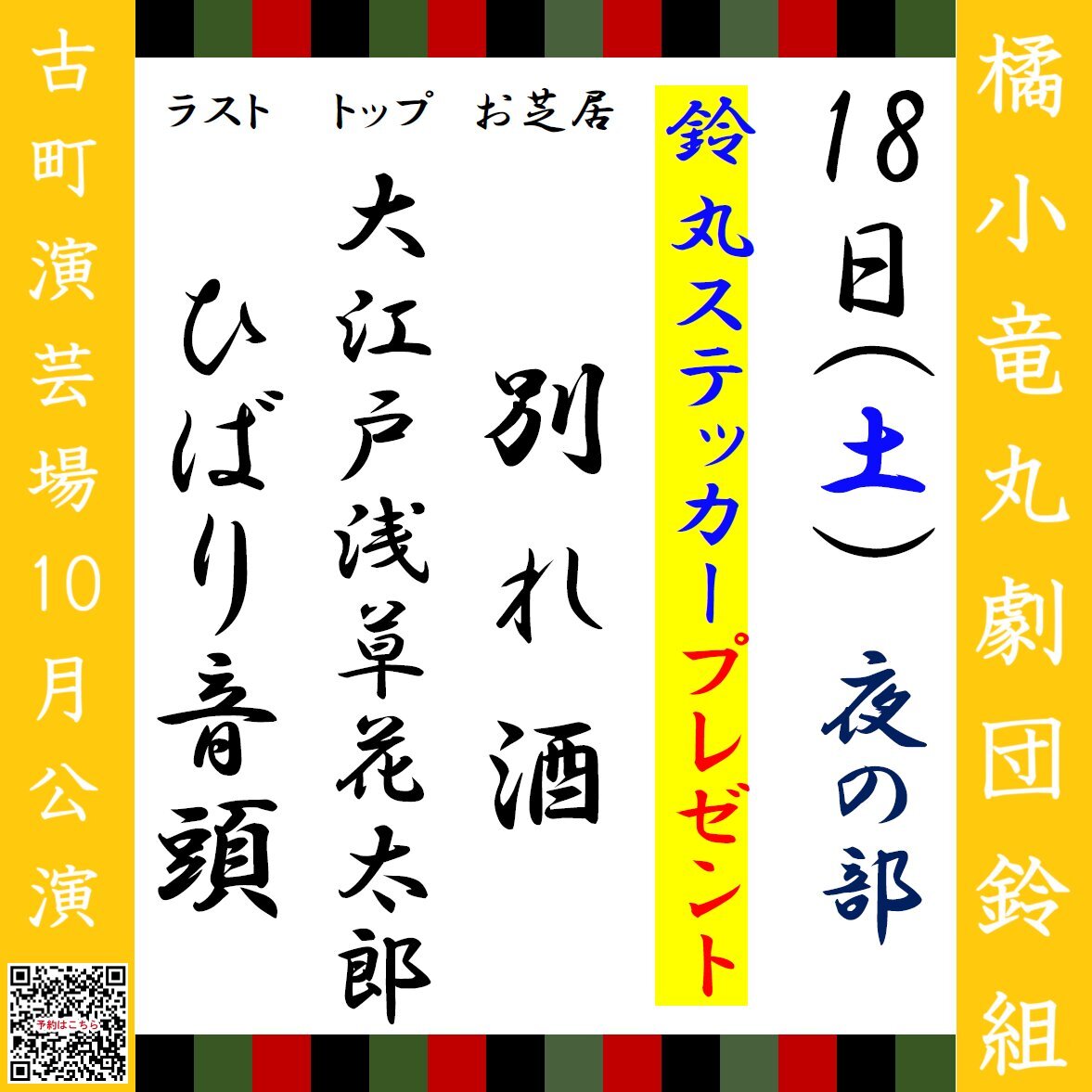 🏮#橘小竜丸劇団鈴組 10月公演🏮 本日10/18(土)のお外題になります🌸 【昼・夜】鈴丸ステッカープレゼント🎁 ⚠10月公演も後半戦⚠ 皆様のご来場、心よりお待ちしております🌟 #大衆演劇 #古町演芸場 昼の部 12:00開演(11:00開場) 夜の部 17:00開演(16:30開場) 料金:当日2,200円 pic.x.com/k1BnTBuORR