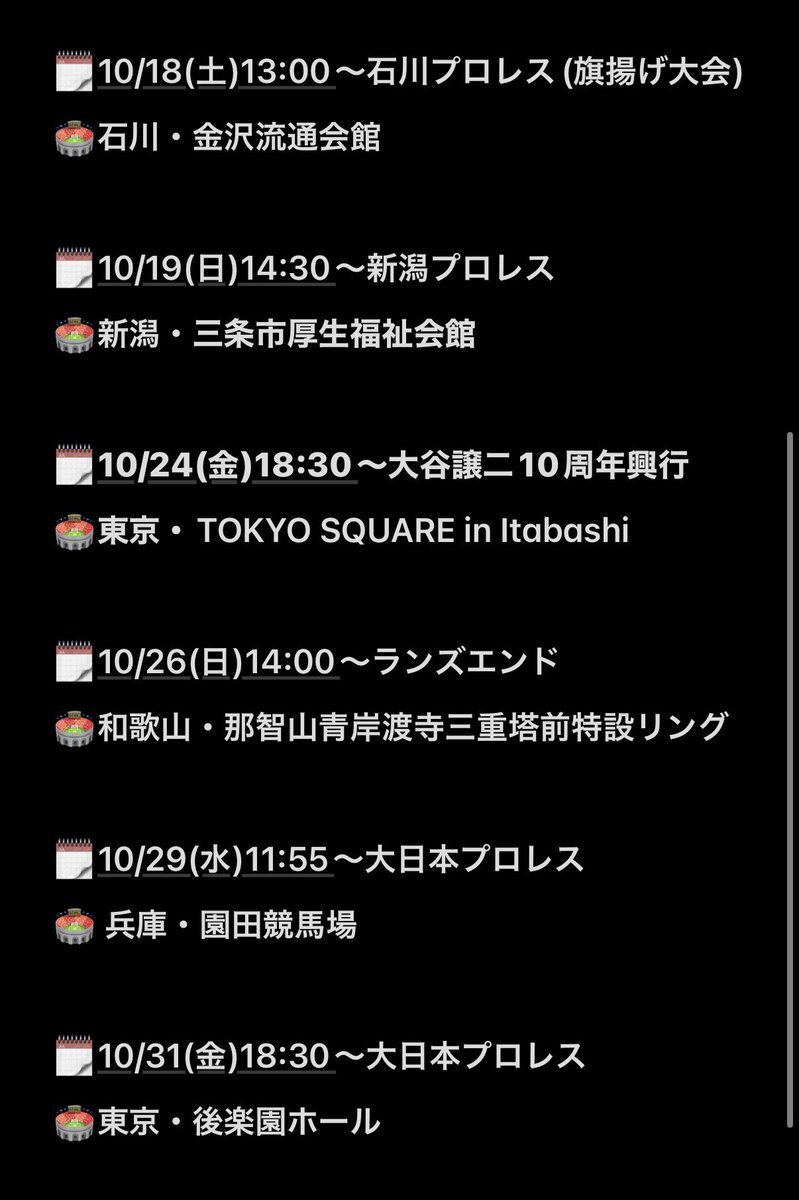 10月後半戦スケジュール 石川→新潟→東京→和歌山→兵庫→東京 ストロングヘビー級王者として 大日本の大会でも他団体の大会でも ストロングヘビー戦線に興味を持って頂ける闘いをします。 ご来場お待ちしてます。 #ランズエンド #石川プロレス #新潟プロレス #大谷譲二10周年記念興行 #bjw #bjw1000 pic.x.com/1etr5gdUSY