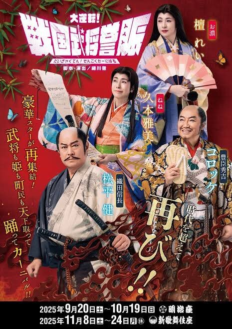宣伝を見て気になってたから新歌舞伎座まで来た。 一幕を観終わっての感想は笑い過ぎてお腹痛い #大逆転戦国武将誉賑 #松平健 #コロッケ #檀れい #久本雅美 pic.x.com/kdHFBYuOou