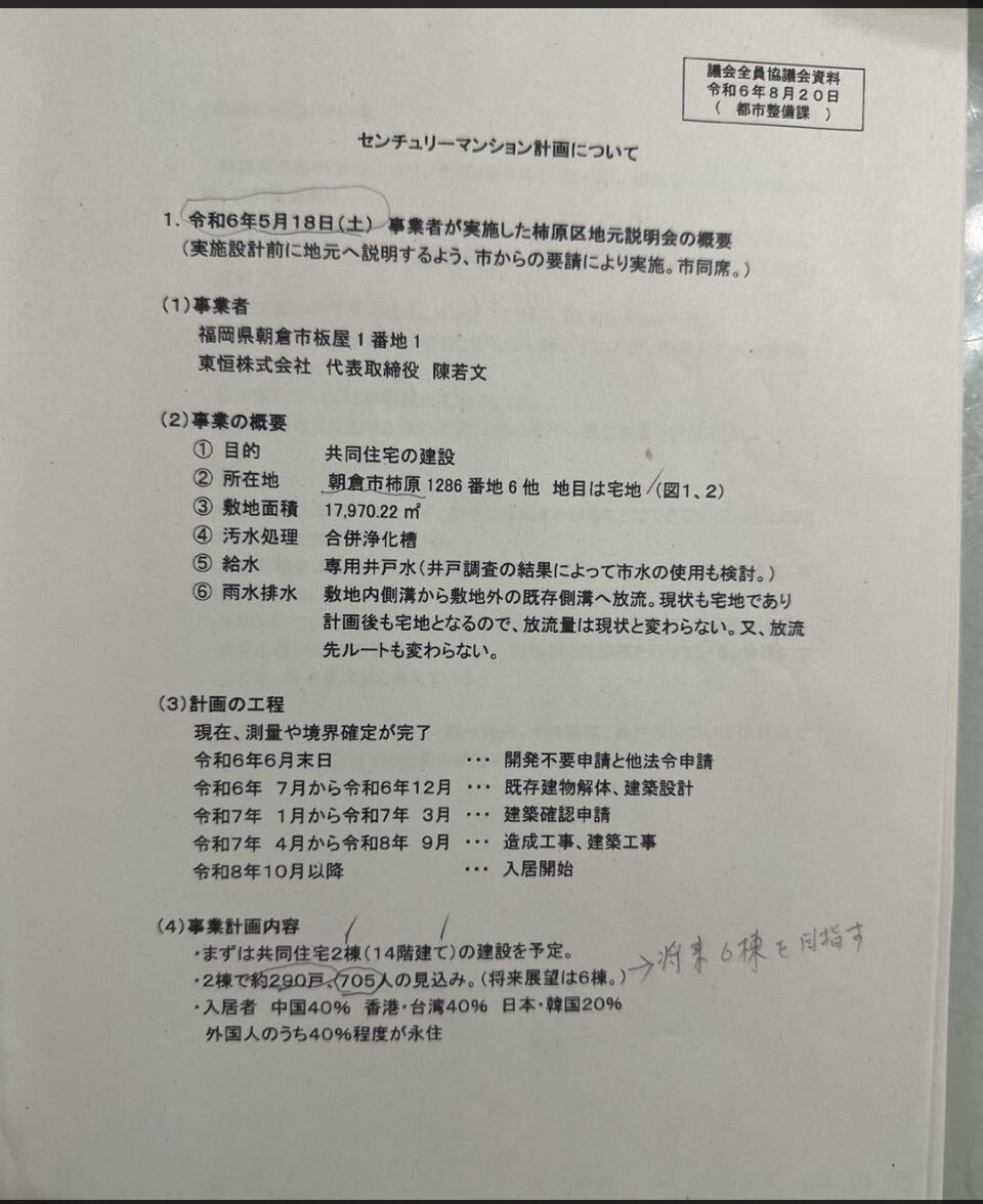 【拡散希望】 福岡県朝倉市の中国人居住センチュリーマンション建設計画 事業者 福岡県朝倉市板屋1番地1 東恒株式会社 代表取締役 陳若文 事業の概要 ①目的 共同住宅の建設 ② 所在地 朝倉市柿原1286番地の他地目は宅地 詳しくは写真を見てください