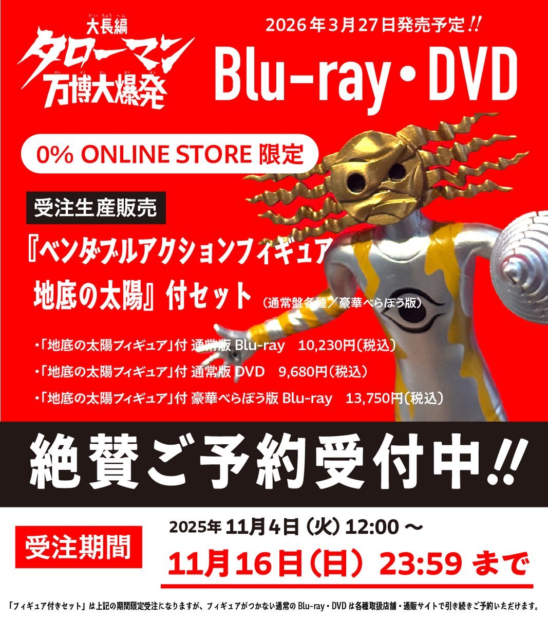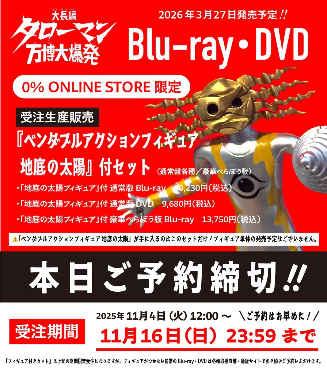 / 📢まもなく受注受付終了! 【11/16(日)23:59まで】 \ 『大長編 タローマン 万博大爆発』 Blu-ray・DVD 【0% ONLINE STORE 限定】 #地底の太陽 フィギュア付セット ⭐️受注期間は【11/16(日)23:59まで】 地底の太陽フィギュアが手に入るのはこのセットだけ! お見逃しなく!