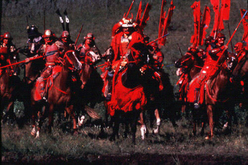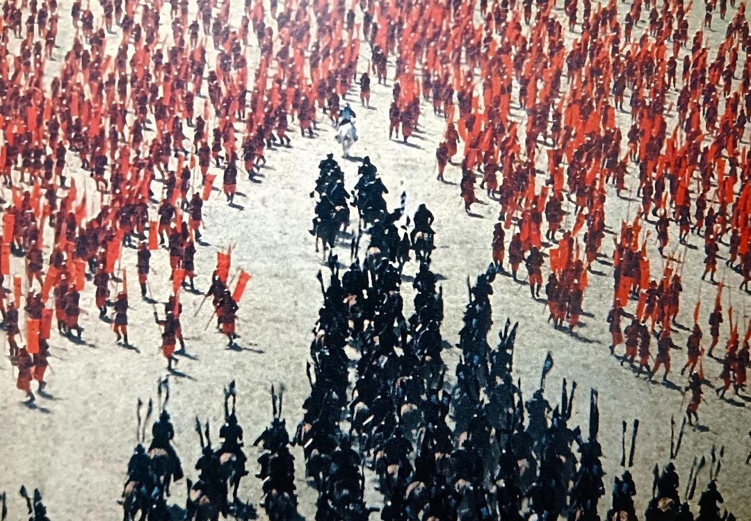 #天と地と」⑦ 「#赤と黒のエクスタシー」。 これ、なかなかいい惹句でしたね〜! 具足を上杉・黒、武田・赤で統一して、敵味方の識別がはっきりしている中、謙信だけは白銀。 色彩効果は抜群で、のちの #松岡昌宏 版「天と地と」でも踏襲されています。 左/公開当時とても有名になった名シーン pic.x.com/nOCPVXbFGF