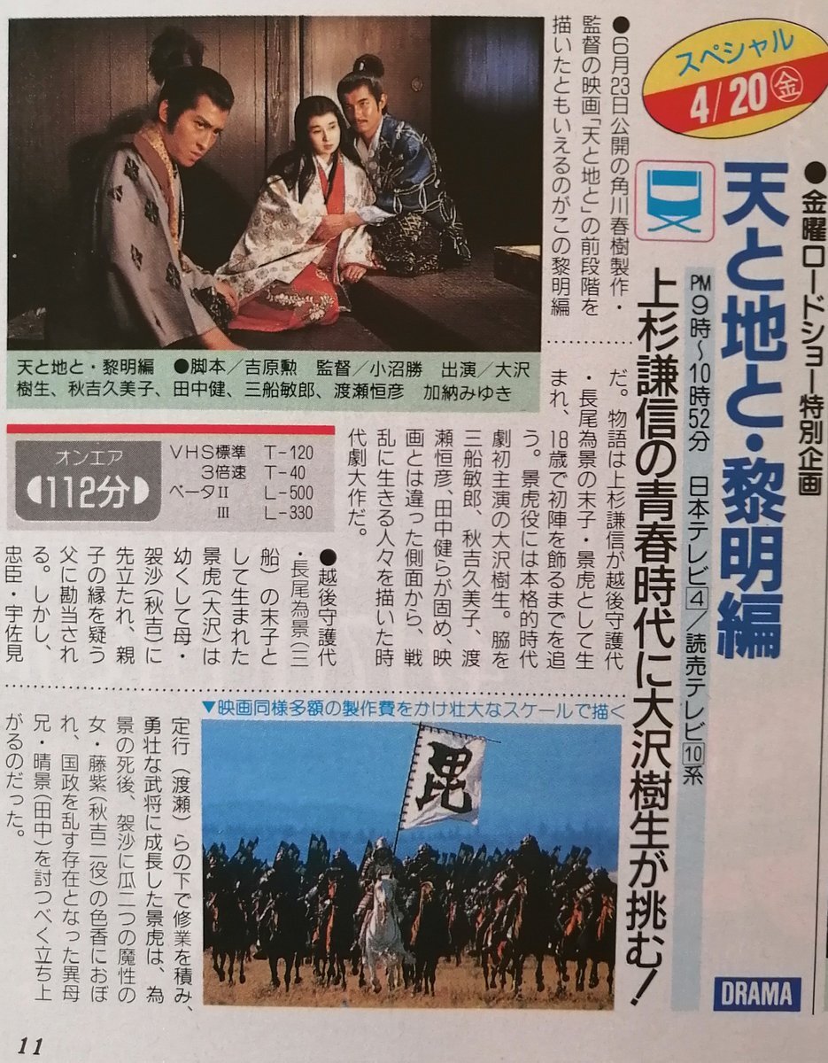 #天と地と」二度目の映像化は、映画とタイアップした 「#天と地と・黎明編」(1990NTV )ということになります。 兄と争って国主の座を継ぐ上杉謙信の10代に焦点を当てています。 謙信に #光GENJI の頃の #大沢樹生(この人、このあと謙信以上に波乱万丈の人生を送ることに…)。 (↓返信欄へ続く) pic.x.com/91gfZSnVi8