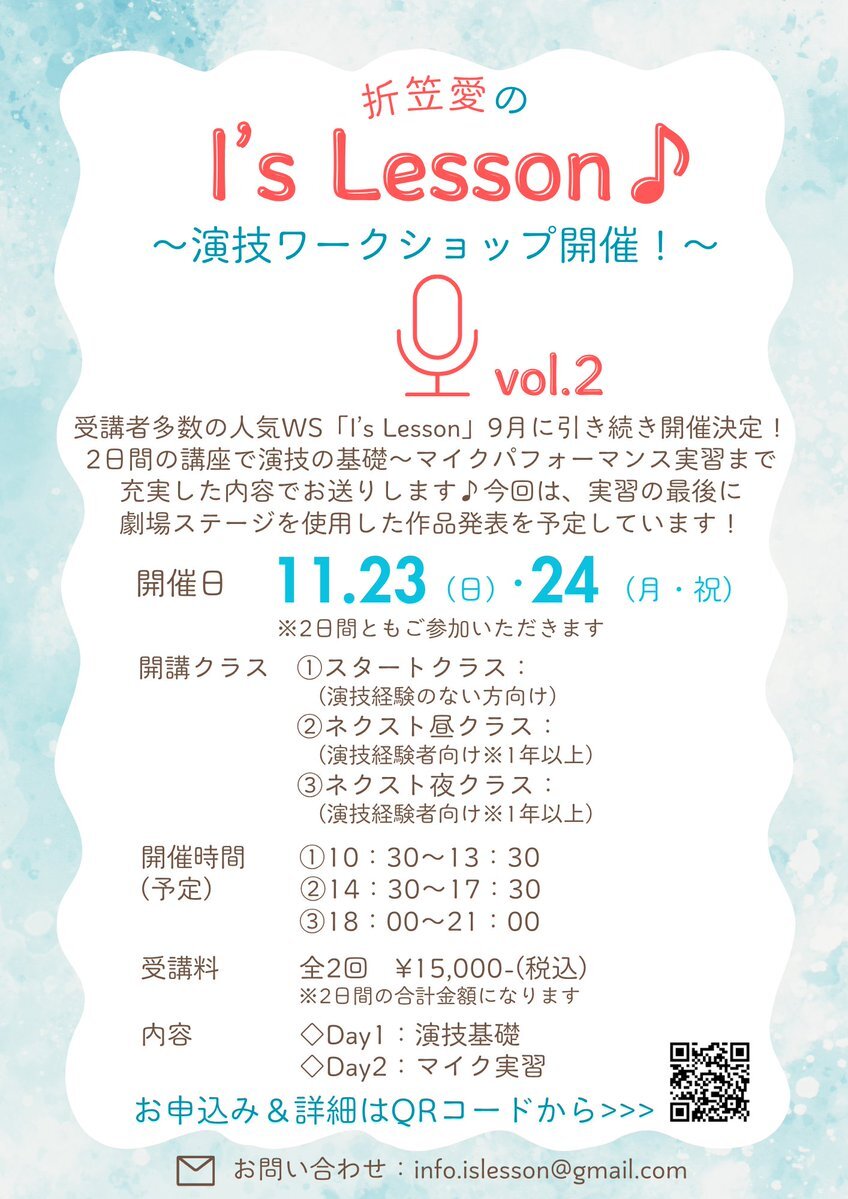 【折笠愛の演技ワークショップ】 ご好評につき、第2弾が開催決定❣️ 開催日:2025年11月23日(日)・24日(月・祝) 2日間で基礎から演技を学びます🎙️ 今回は劇場ステージを使用した作品発表も予定! [I's Lesson♪ vol.2]お申込み・詳細はコチラから▷forms.gle/s2tmudzty7tRmx… #折笠愛 #ワークショップ
