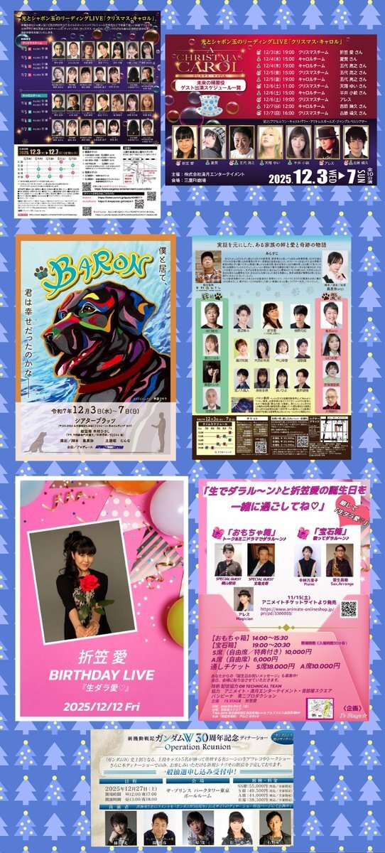 皆さま♡ 12月のご予定は決まりましたか? 私 4つのステージに出演します!是非✨4色の折笠愛を観に来てください🥰 ⭐『クリスマスキャロル』 12/3(水) 19時 ⭐『BARON』   12/4〜7 ⭐『Birthday LIVE』 12/12 2ステージ ⭐『ガンダムW   ディナーショー』 12/27 2ステージ