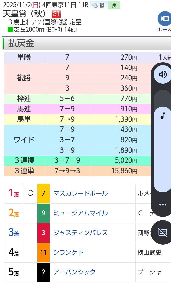 #天皇賞秋結果 ◎1着…予想結果📝◎→▲→無→無→★ 3連単&3連複ハズレ💸💸💸 sports.yahoo.co.jp/keiba/race/res… ◎⑦#マスカレードボール 優勝🏆 #エフフォーリア & #イクイノックス 同様ダービー2着からの参戦で戴冠🥇 3歳馬のワンツーで世代レベルは高そうですですね😊 来週G1は中休み🏇