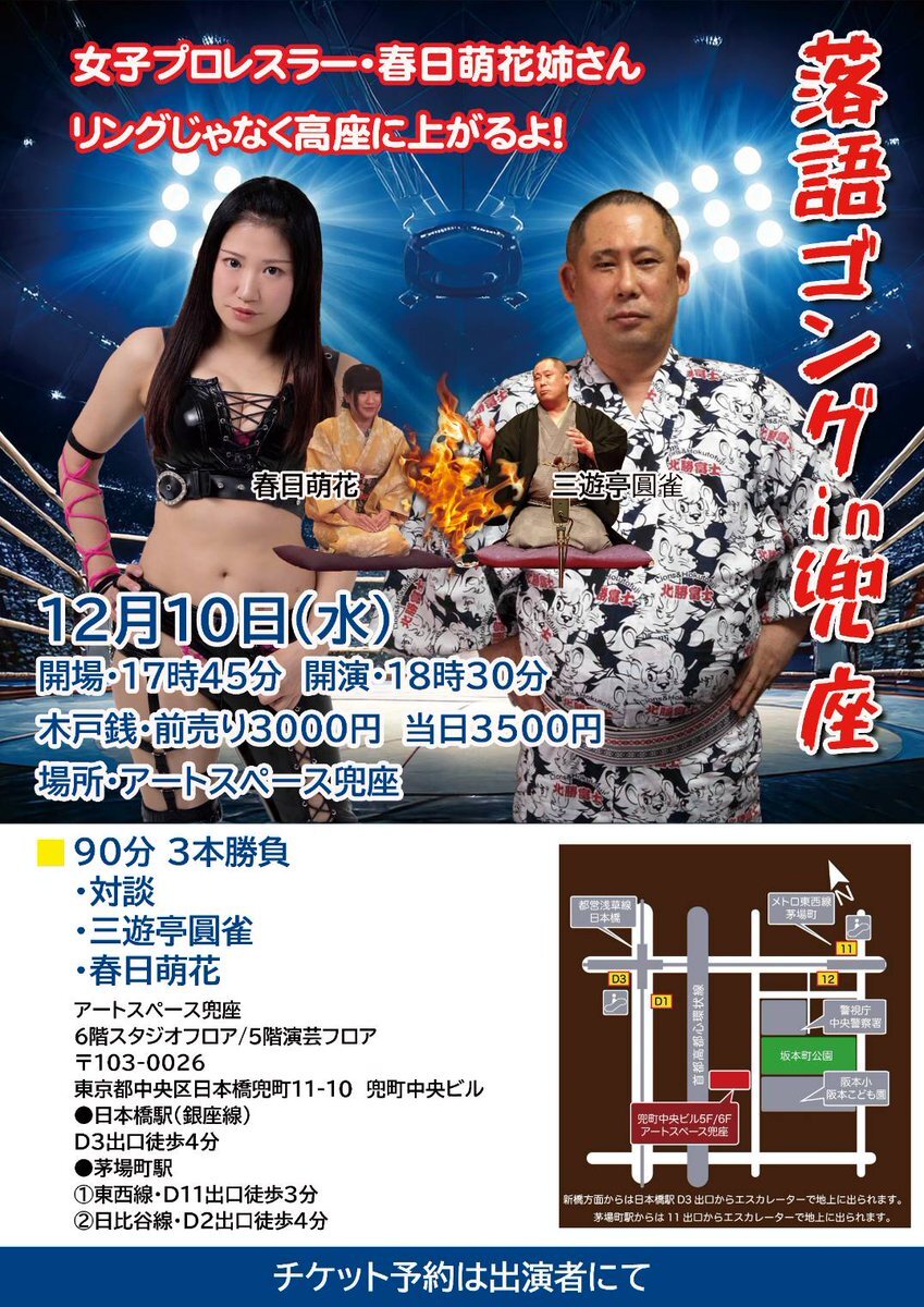 12月10日 落語ゴング 女子プロレスラー・春日萌花姉さんリングじゃなく高座に上がるよ❗️ 12月10日(水) 17時45分開場 18時30分開演 木戸銭・前売り3000円 場所:アートスペース兜座 席数・45席 ご予約は春日さん又は圓雀まで sanyuteiharuba@gmail.com #落語 #女子プロレスラー pic.x.com/HLwkz21bds