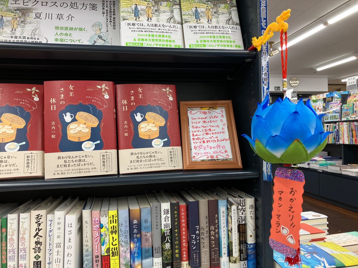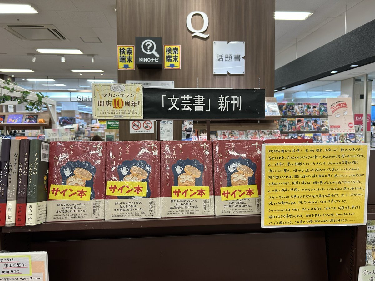 \文学担当Iのおすすめ📕/ #古内一絵 さん『#女王さまの休日 マカン・マランボヤージュ(#中央公論新社)』 シャールのともす「マカン・マラン」の灯はこれからも何度でも安らぎと明日を生きる希望をくれるそんな1冊です✨ 文学新刊コーナー【Q01-11】にて! pic.x.com/sMdxemLitI