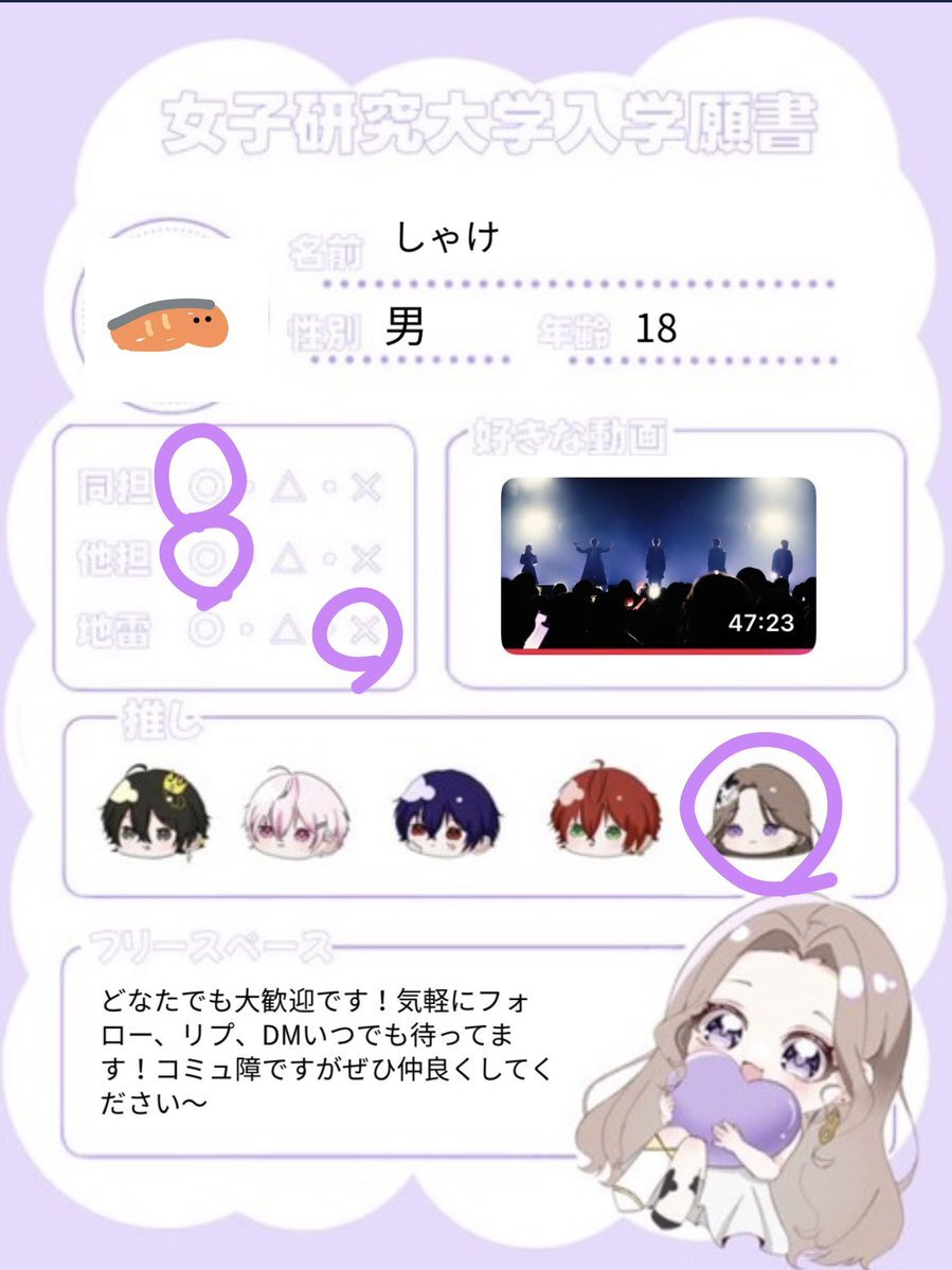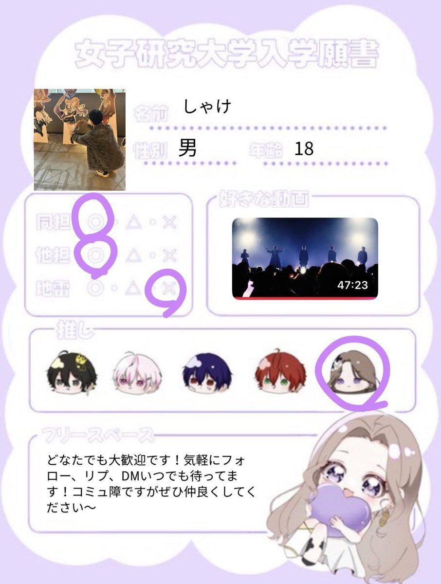 Xはずっと見る専で、最近女子研究大学を好きになった初心者です🍃 ニキニキとじゅはちが好きで、 はじめて推し活SNSをつくってみました🌷 12月のファンミは1人で参加予定です☺️ ゆるくお話できるお友達ができたら嬉しいので、気になった方ぜひ仲良くしてください🫶 #女研リスナーさんと繋がりたい