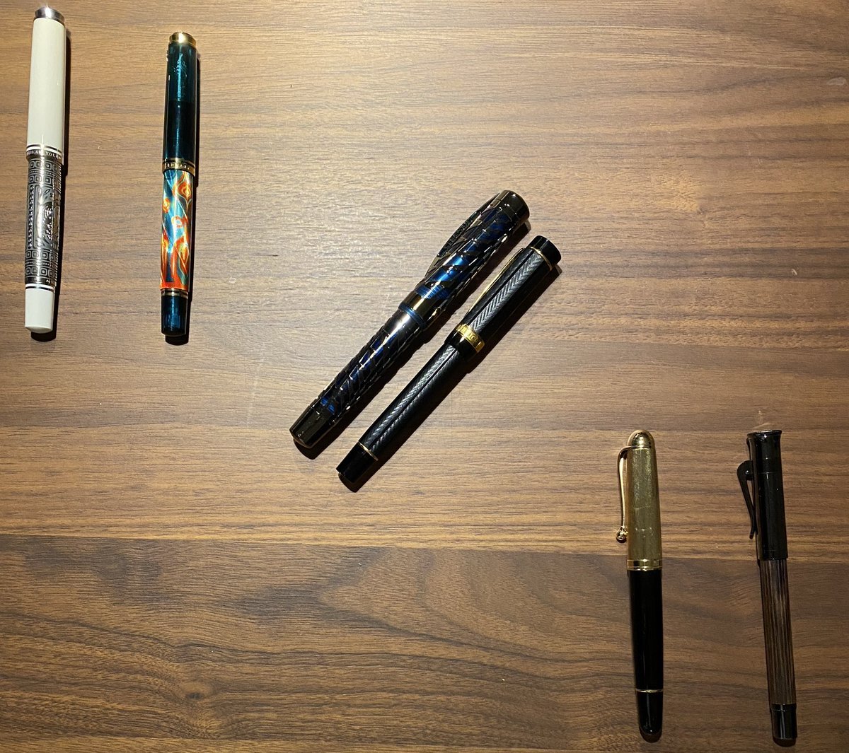 #好きな万年筆で11月11日を作る 今年はうちの舶来組で🚢 この子たちを迎えて薄くなったお財布はいまだ回復していませんが心は大満足です 左から アウロラ マントヴァ アウロラ トロピチ ヴィスコンティ ディヴィーナ デュポン ニューラインD デュポン アンダルシア pic.x.com/Fs7cmEG1QF