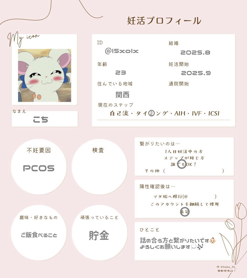 色々ありましたが今月から不妊治療再開〜っていうことで妊活垢作ってみました…! お気軽にフォローください🪿 素敵なテンプレお借りしました🌷 @tama_26_ #妊活垢さんと繋がりたい #妊活してる人と繋がりたい #妊活プロフィール pic.x.com/ycQQakWtpu