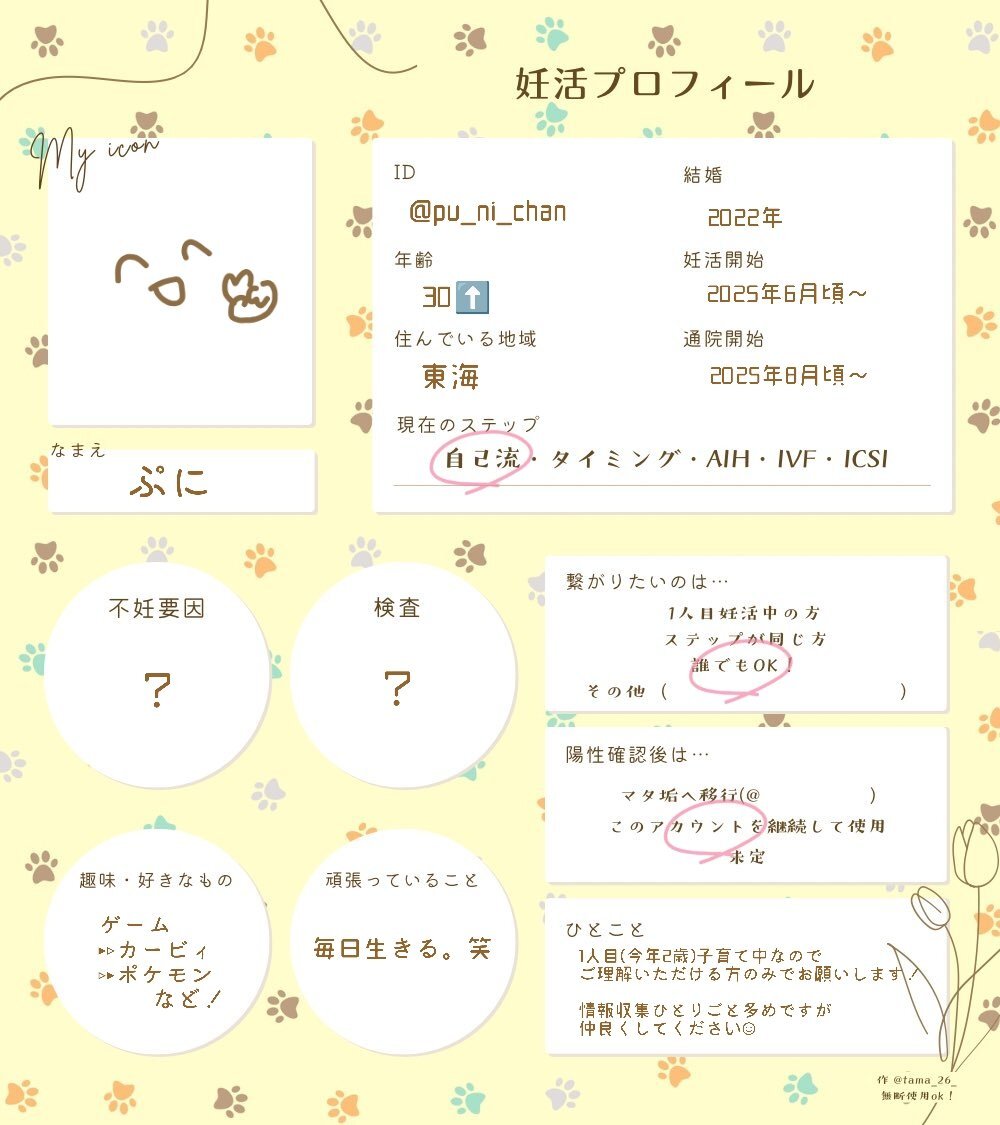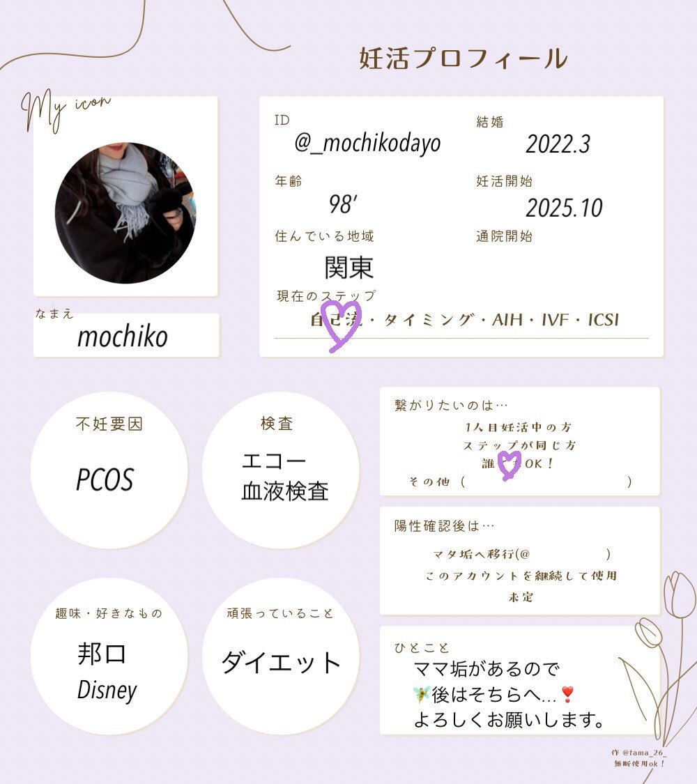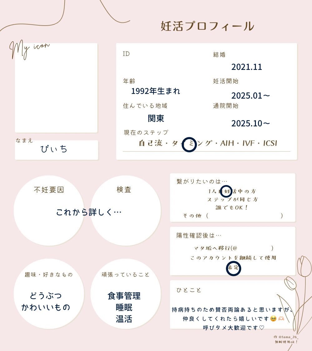 妊活プロフィール更新✒️ お馴染みたまちゃん様( @tama_26_ )のテンプレ拝借🙏💓 採卵②が終わり来月移植ですがひとまず更新したので、何卒😌 #妊活垢さんと繋がりたい #妊活してる人と繋がりたい #不妊治療 pic.x.com/EoAe4LXudL
