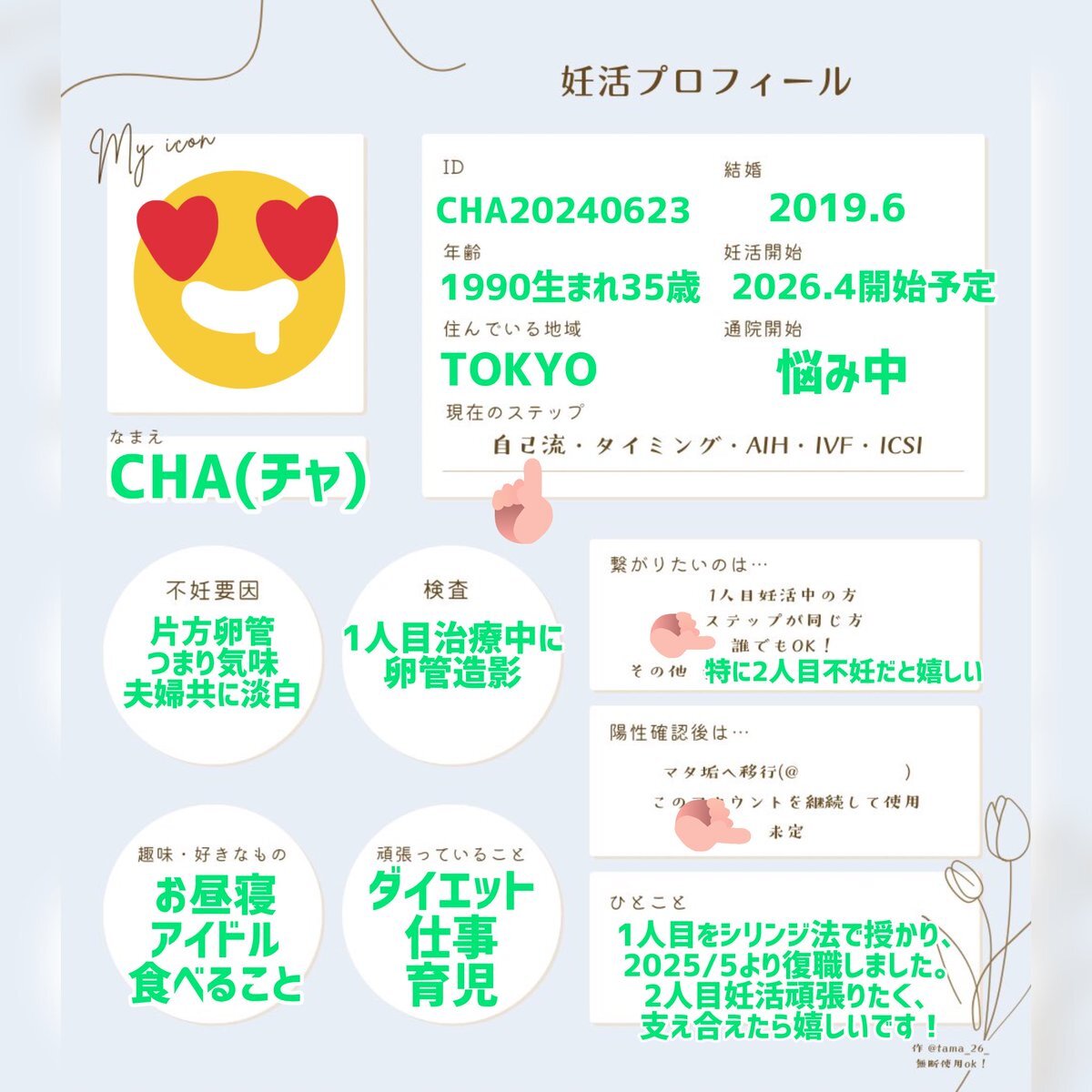 #妊活プロフィール 作成しました。 第2子妊活開始予定です❕ よろしくお願いいたします。 PCOSですが妊娠歴があり、未治療です。 @tama_26_ さんよりテンプレお借りさせて頂きました🙏🏻 #妊活してる人と繋がりたい pic.x.com/dDpyDUnzm2