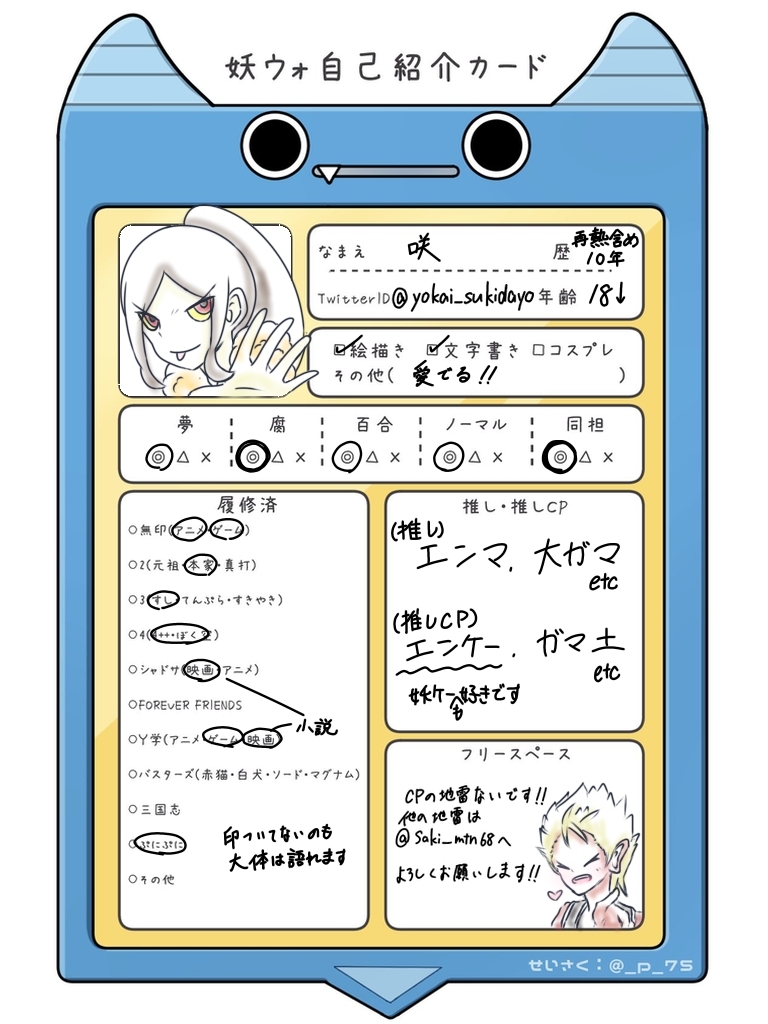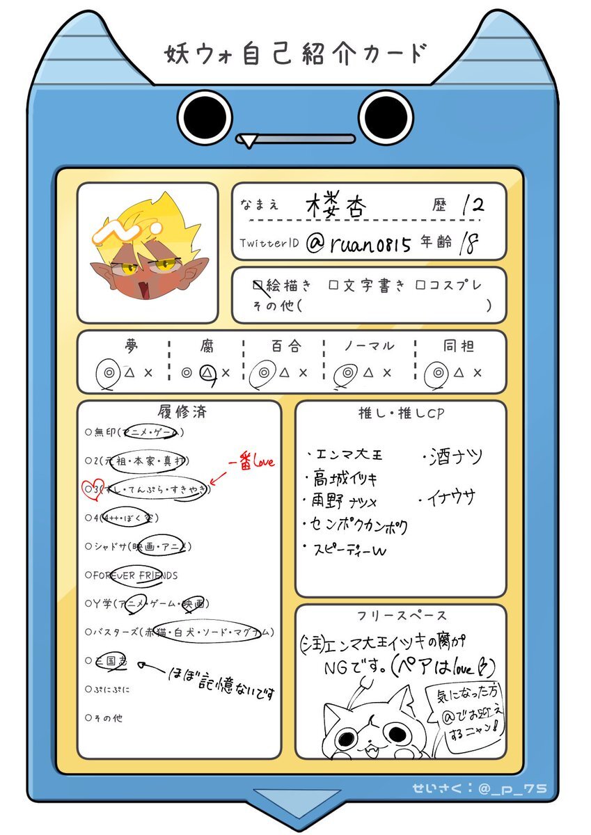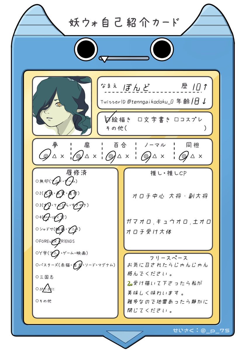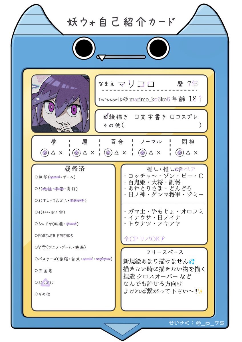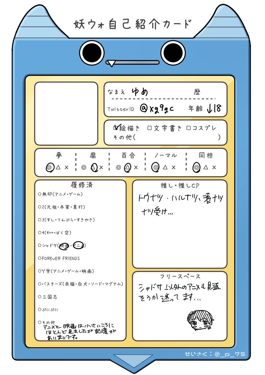 #3連休はフォロワーさんが増えるらしい #妖怪ウォッチ絵描きさんと繋がりたい #自己紹介カード テンプレお借りしました 妖ウォ再熱🔥です!! よければ繋がってください~!!🫶 pic.x.com/zaToMwbugj