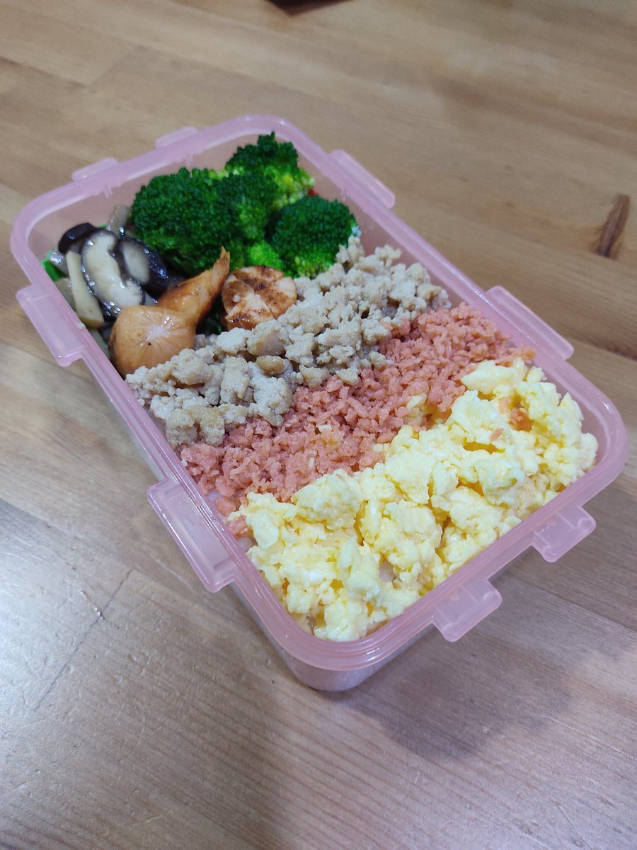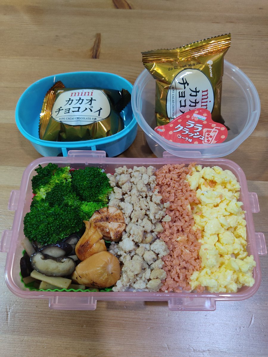 今日は、3色そぼろ弁当を作りました😊鶏&卵そぼろ、鮭フレークの組み合わせです! おかずは、ブロッコリー、ソーセージ、キノコのバターソテー。 スナックタイムには、マシュマロ入りのミニチョコパイ🍫姫はゼリー付きです👸 #お弁当記録 #マレーシア #子どものいる暮らし pic.x.com/CeyLQ4r2qr