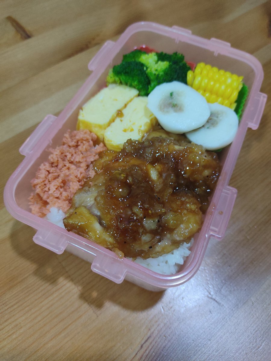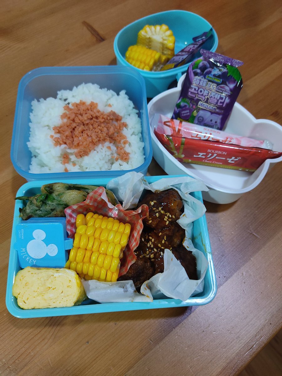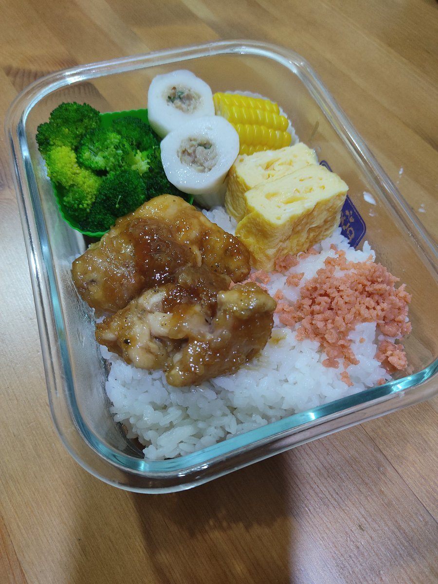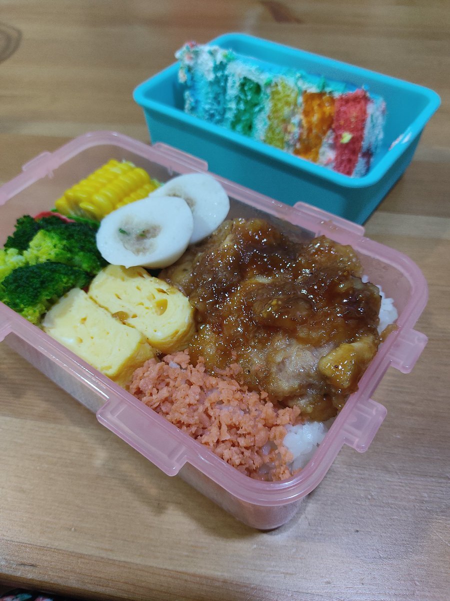 今日は、照り焼きチキン弁当です🍱 おかずは、 卵焼き とうもろこし ブロッコリー 鶏つくね入りのフィッシュボール。 なんなく入れた、鮭フレークで彩りがUPしました🐟 スナックタイムは、 息子のバースデーケーキの残り🎂レインボーケーキです🌈 #お弁当記録 #マレーシア #子どものいる暮らし pic.x.com/9QF1tzGwQI