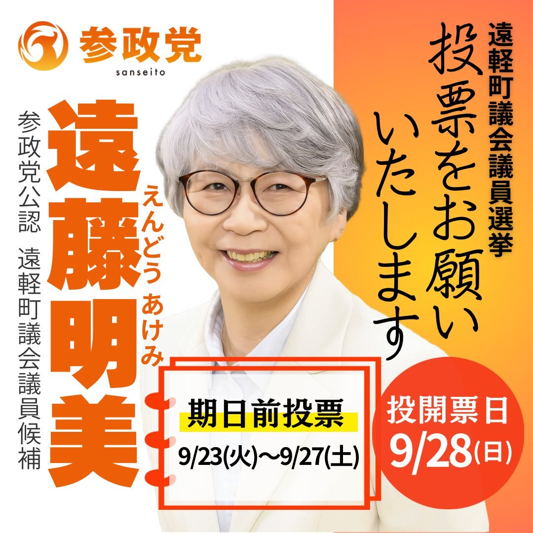 遠軽町の有権者の皆様、鉛筆持ったら✏️投票用紙に「遠藤明美」とお書きください🗳️ 本日から期日前投票も始まっています。 宜しくお願い致します🙇♀️ 遠藤明美さん 北海道遠軽町 参政党 #遠藤明美 @motti19651012 #遠軽町 #遠軽町議会議員選挙 #子供たちの未来を守りたい #参政党 x.com/sansei_hk/stat…
