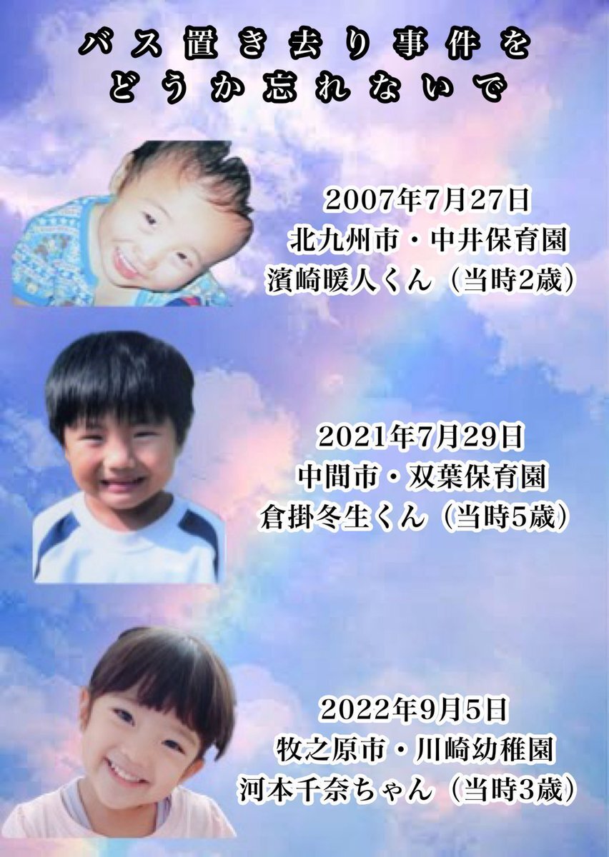 #子供の車内置き去りを防ごう  バス置き去り!! 忘れない、風化させない! 起きる筈のない事件! 降りた時に確認すればわかる筈!無責任!💢 存続してる幼稚園があるのが許せない!💢 可哀想で堪らない!😢 月日が経っても、ご両親の無念悲しみは癒されない! 3人のお子様のご冥福をお祈りします!