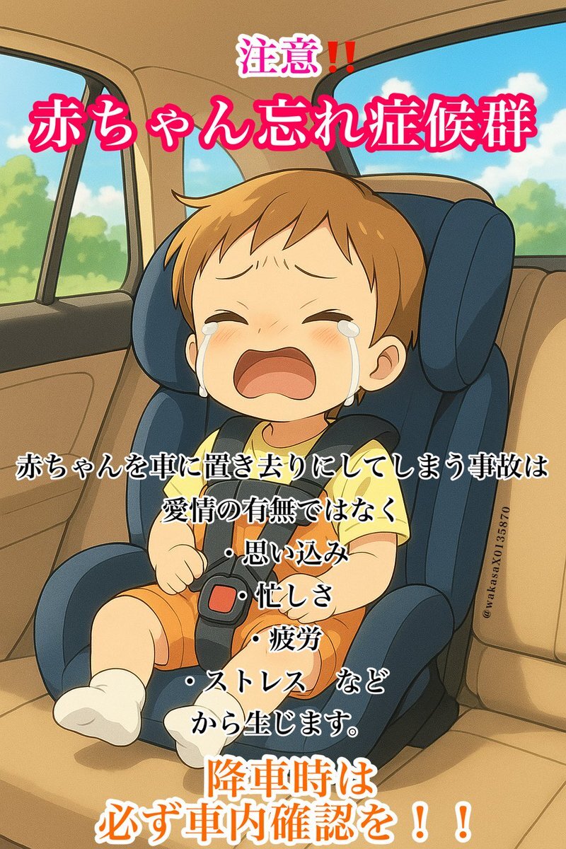 📣声かけ合って防ごう📣 赤ちゃんを車に置き去りにしてしまう事故は 愛情の有無ではなく ・思い込み ・忙しさ ・疲労 ・ストレス などから生じます。 『後部座席チェックした?』 そんな一言が命を救います。 周りの大人で声を掛け合い 赤ちゃんの命を守りましょう。 #子供の車内置き去りを防ごう pic.x.com/1vP78jKQnY