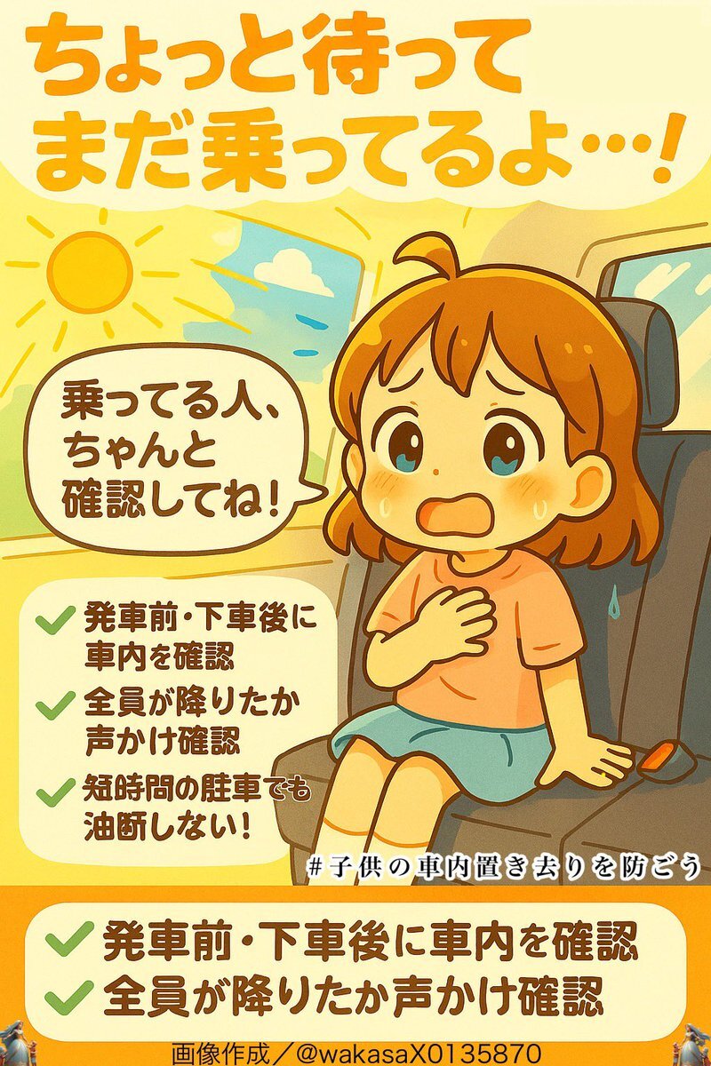 お父さん、お母さん お祖父ちゃん、お祖母ちゃん 小さなお子さんをお世話する全ての皆さん 取り返しのつかない一生の後悔 絶対にさせたくありません🙏🍀 後部座席チェックを習慣に👆️ #子供の車内置き去りを防ごう pic.x.com/MMCFMQ5eRU