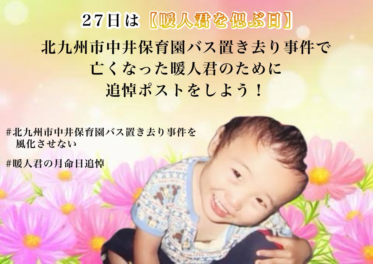 2007年7月27日 北九州市中井保育園の送迎車に濱崎暖人くん(当時2歳)が取り残され、熱中症で亡くなりました。 #暖人君の月命日追悼 毎月27日、 追悼企画を行います。 事件を風化させないために ご理解ご協力よろしくお願いいたします🙇‍♀️ 暖人君にたくさんのお花を💐 #子供の車内置き去りを防ごう pic.x.com/dYFbCdUirM
